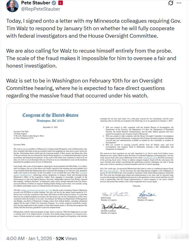明尼苏达州第八国会选区皮特·斯陶伯:今天,我与我的明尼苏达同僚签署了一封信,要求州长蒂姆·沃尔茨(Tim Walz)在1月5日之前回复,说明他是否会全面配合联邦调查人员和众议院监督委员会的调查。我们还要求沃尔茨完全回避此次调查。欺诈规模之大,使他无法监督一场公正、诚实的调查。沃尔茨计划于2月10日在华盛顿出席监督委员会的听证会,届时他预计将面临关于他任内发生的大规模欺诈行为的直接质询。