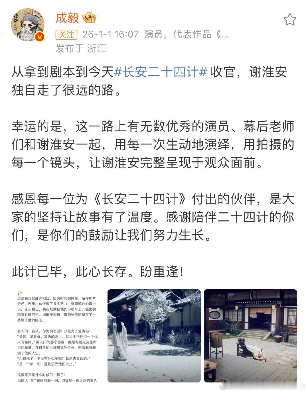 成毅告别谢淮安成毅告别长安二十四计幸运的是,这一路上有无数优秀的演员、幕后老师们和谢淮安一起,用每一次生动地演绎,用拍摄的每一个镜头,让谢淮安完整呈现于观众面前