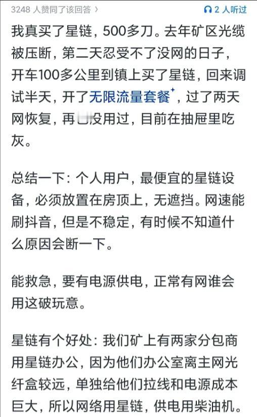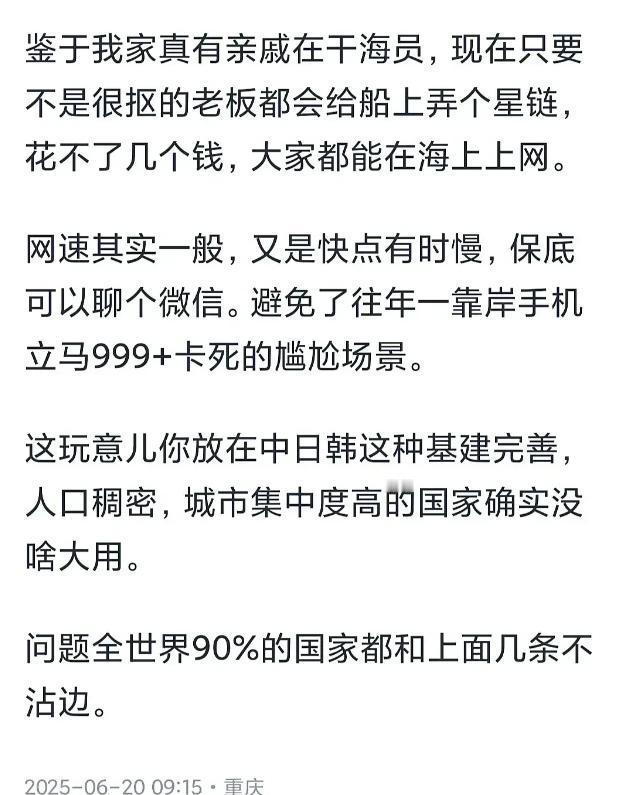 为什么大家不再提星链了(包括外网)?国内一个月几十的套餐都嫌贵,知道星链一个月要多少钱吗?更不要说星链的机顶盒多么庞大了。 先说价格,国内手机号套餐普遍每月几十块,星链呢?基础版每月收费,折算人民币超过两千,高端套餐直奔五千,还得一次性掏近万元买那个锅盖大的终端设备。 这价格放国内,够普通家庭交两年宽带费了——不是没人想用,是真用不起。 贵就算了,关键体验没跟上宣传。星链本质是低轨Wi-Fi,但它的信号传输分两种情况: 有地面基站的地方,卫星直接连基站,速度能到100Mbps以上;没基站的地方,卫星得像接力赛一样互相传信号,速度立马跌到几Mbps,延迟高得能让视频通话卡成PPT。 比如在西藏阿里这种偏远地区,用户实测下载速度从市区的150Mbps暴跌到3Mbps,刷短视频都得等缓冲。这种“看天吃饭”的体验,让不少尝鲜用户直呼上当。 再说技术底子。早期星链卫星没星间激光链路,完全依赖地面基站中转。 美国本土有32个大站撑着,信号还凑合,但全球90%的海域和荒原根本没基站。 这就导致一个尴尬局面:宣传说“全球覆盖”,实际在海上、沙漠,信号比2G还慢。 2025年有渔民投诉,在太平洋作业时,发一条定位短信要等5分钟——这时候谁还关心“全球第一卫星网”的头衔? 成本问题也在拖后腿。一颗星链卫星制造成本60万-100万美元,看似不贵,但要维持全球服务,需要4万颗卫星同时在轨。 马斯克靠火箭回收压低成本,但用户端的账算得明白:每月两千块的网费,够买200G流量的5G套餐,在城市里走到哪用到哪,何必守着个笨重的“锅盖”? 特别是国内5G基站超300万座,县城以上99%覆盖,星链的“偏远优势”在国内根本没市场。 还有个隐性门槛:安装条件苛刻。星链终端需要无遮挡的开阔视野,城市公寓用户得爬楼顶装设备,物业还不一定允许。 农村用户倒是有地方装,但一算账:每年两万多的网费,够给家里拉光纤+买5G路由器,还能省钱买台新电视。 这种情况下,除了极少数户外工作者,谁愿意当“冤大头”? 市场反馈也在退烧。2023年星链刚入华时,论坛里全是“马斯克黑科技”的讨论,到2025年,二手平台上转卖终端的帖子比比皆是,标价跌到原价的6折都难出手。 用户吐槽集中在三点:“速度不如宣传”“太贵用不起”“搬家就得重新买设备”。 反观国内,中国星网的“GW星座”开始提供百兆级卫星宽带,每月不到三百块,还兼容5G基站——性价比碾压下,星链自然淡出话题。 归根到底,星链不是技术不行,是水土不服。在北美地广人稀的地方,它是“救命网”,但在基站密度全球第一的中国,它成了“鸡肋”。 当用户发现每月两千块的网费,换来的是时而流畅、时而卡顿的体验,而隔壁光纤+5G组合又快又便宜,谁还会天天聊星链? 热度退潮,本质是市场用脚投票的结果。