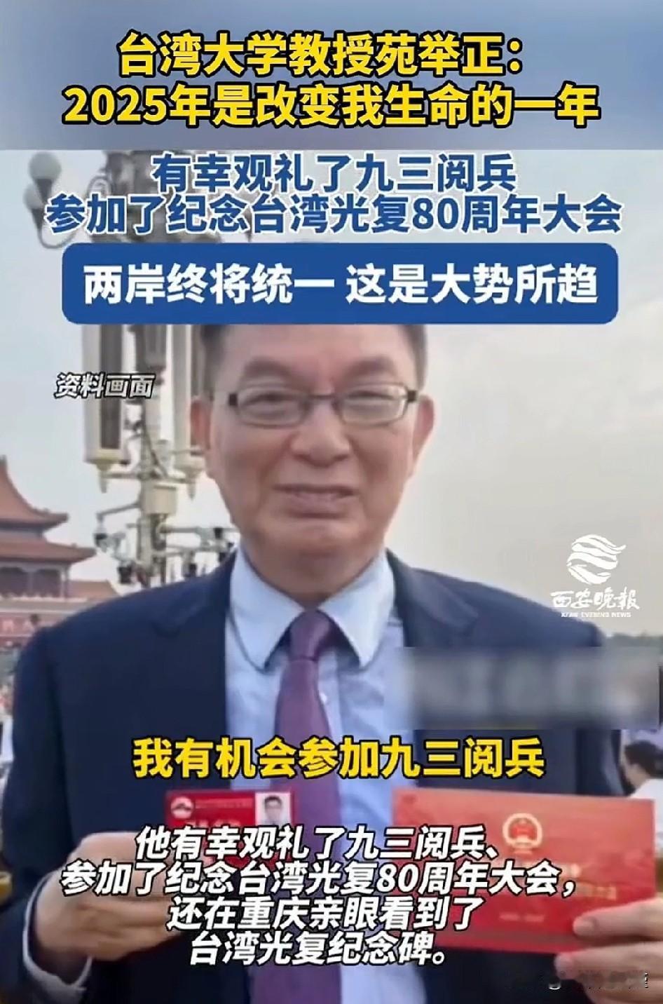 这才是民心所向,这才是教授该有的样子,这才是台湾该有的样子。 台湾大学教授苑举正说2025年是改变他命运的一年。25年苑举正教授不仅参加了九三阅兵,还参加了台湾光复80周年大会。这是每个台湾人都应该光荣的事。 苑教授无时无刻都在宣传两岸统一,两岸一家亲的信念。台湾需要更多的像苑举正教授这样的人,大家也相信在台湾,会有无数个苑举正会出现。 这就是民心所向!!! 苑举正 台湾 中国台湾 台湾统一最有可能以什么样的方式 台湾统一