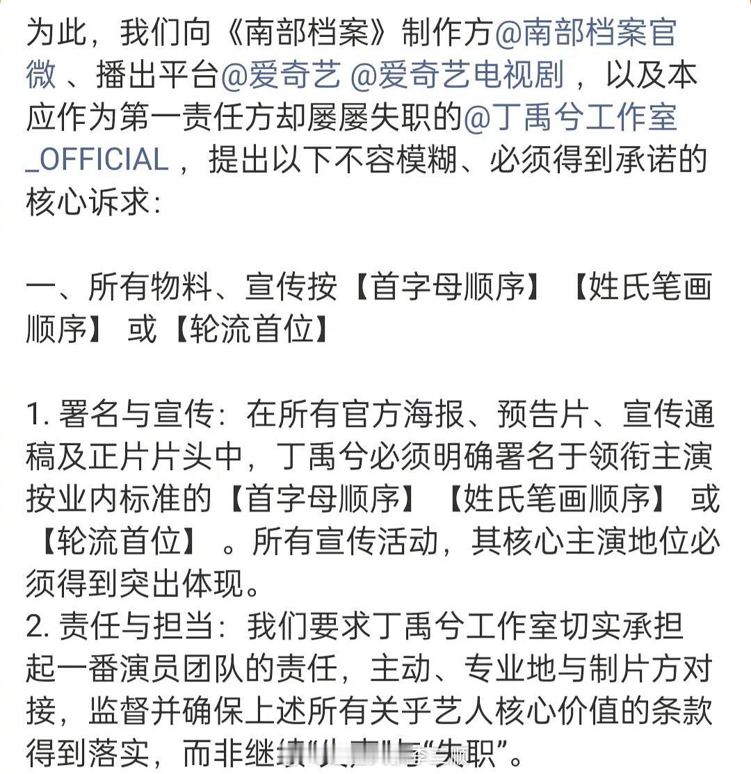丁丝要求《南部档案》剧方把演员表改成按首字母排序或轮流一番,《南部档案》张新成、丁禹兮平番双男主,张在前