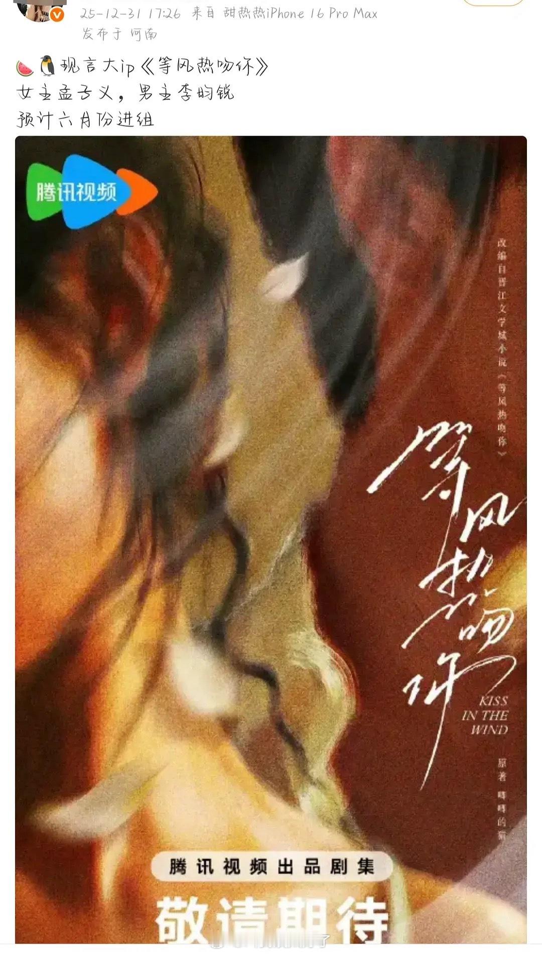 孟子义和李昀锐要四搭了?这次是现言《等风热吻你》?不会这么快吧?