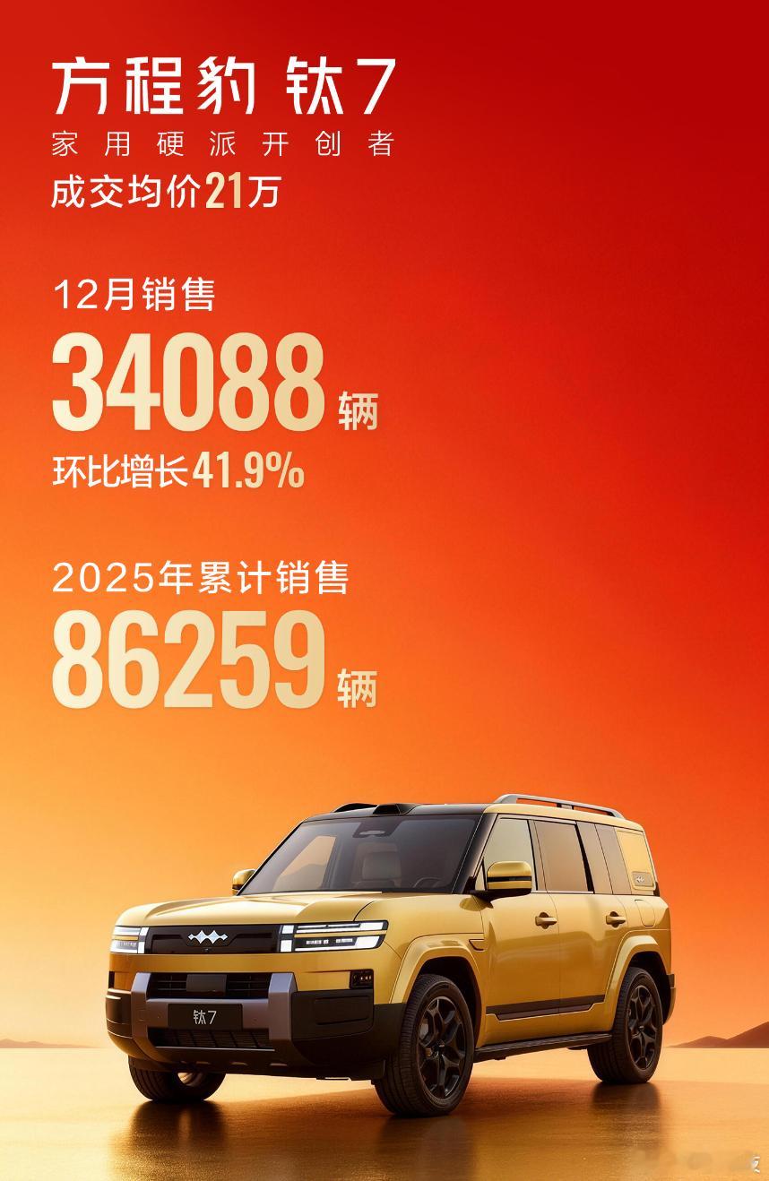 再次集体起立,感受下方程豹恐怖的支配力,新势力至少Top3!12月销售50868辆,2025全年销售234637辆,环比、同比全线暴增。钛7一举冲上了3.4万+的高地,基本锁定混动、方盒子三连冠,恐怖如斯!!!