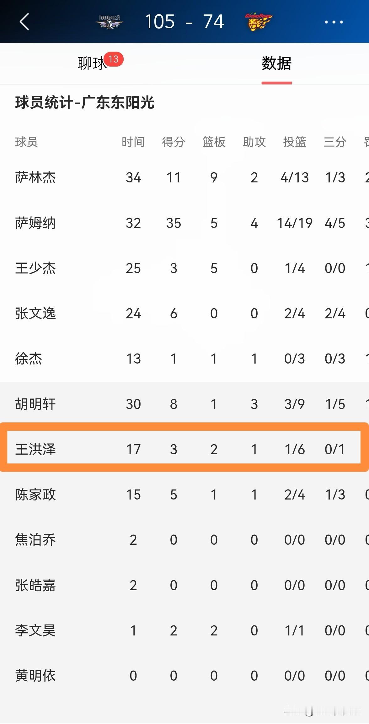 广东东阳光小将王洪泽的心理素质真是太差了!在今天广东东阳光客场以74:105惨败于北京北汽的比赛中,年仅18岁的小将王洪泽明显紧张过度,因此他的表现非常失常。 全场比赛下来,王洪泽替补出战17分钟,投篮6中1,其中三分球1中0、罚球2中1仅仅得到3分,他的场上正负值为-15。 如果王洪泽想要在日后成为一名球星,他必须增强自己的心理素质,只有拥有过硬的心理素质才能成为球队的支柱。