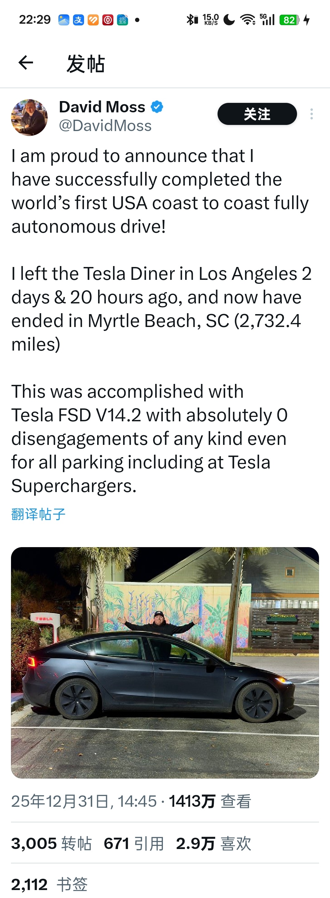 去年最后一天,Tesla Model 3车主David成功完成世界上第一次从美国西海岸到东海岸的完全自主驾驶。 在2天20小时前从洛杉矶的特斯拉餐厅出发,现在已抵达南卡罗来纳州Myrtle Beach,全程2732.4英里完全由FSD V14.2自行驾驶,0干预,甚至包括所有停车操作。连停车驶入驶出超级充电站都是自动完成,途中,他使用了23个超级充电站。他只负责了插入插头...数据可以在 Whole Mars 的 FSD 数据库公开验证2017 年马斯克就吹牛P说特斯拉将实现横穿美国自动驾驶,但一直没做到...