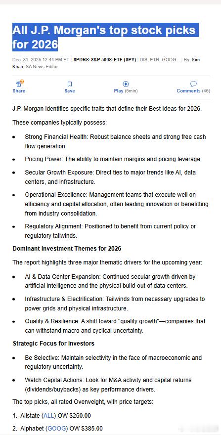 摩根大通 2026 年“最高推荐” 股票(评级均为 增持 / 看好)及对应目标价:安泰保险(Allstate, ALL)目标价 $260字母表公司(Alphabet, GOOG / GOOGL)目标价 $385阿米库斯治疗(Amicus Therapeutics, FOLD) $19Arista 网络公司(Arista, ANET) $175AT&T(T) $33AutoZone(AZO) $4100艾利丹尼森(Avery Dennison, AVY) $195波音公司(Boeing, BA) $240波士顿科学(Boston Scientific, BSX) $135Bright Horizons(BFAM) $160博通(Broadcom, AVGO) $475加拿大太平洋堪萨斯城铁路(CP. TO) C$124Carvana(CVNA) $490卡特彼勒(Caterpillar, CAT) $730CBRE 集团(CBRE) $196Celsius Holdings(CELH) $68查尔斯·施瓦布(Charles Schwab, SCHW) $121花旗集团(Citigroup, C) $124商业金属公司(Commercial Metals, CMC) $78CRH Plc(CRH) $135CVS Health(CVS) $101Dana 公司(DAN) $28Devon Energy(DVN) $44Digital Realty Trust(DLR) $210迪士尼(Disney, DIS) $138DraftKings(DKNG) $42艾利公司(Eli Lilly, LLY) $1150Entergy(ETR) $108埃克森美孚(Exxon Mobil, XOM) $124GE Vernova(GEV) $1000Globe Life(GL) $180Guidewire 软件(GWRE) $300KLA 公司(KLAC) $1485