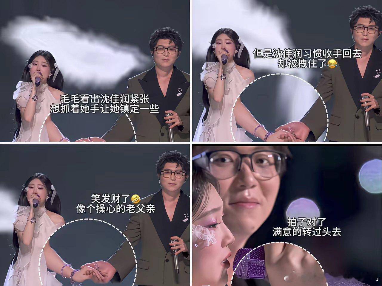 一个人的人品是装不出来的,不信,你看看毛不易,沈佳润在旁边紧张得不行,调都跑完了,可他没露出一点难听的表情,还一直握着沈佳润的手,希望让她放松下来!江苏卫视跨年晚会上,毛不易和沈佳润合唱《不染》,没想到沈佳润第一次大舞台,没准备好翻车了开头就进错拍跑调了,唱着唱着感觉她要哭了,幸好毛不易在旁边一直握着沈佳润的手,给她力量特别暖心的是,沈佳润中间两次想收回手,毛不易都握的太紧了,抽不出来!还有最后,沈佳润终于找到调的时候,毛不易看沈佳润的眼神,真的好像一个老父亲啊!这要是换了别的男明星,估计就冷脸,没这么暖心的举动了!