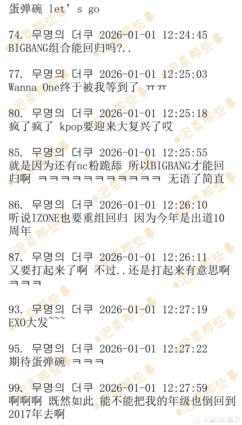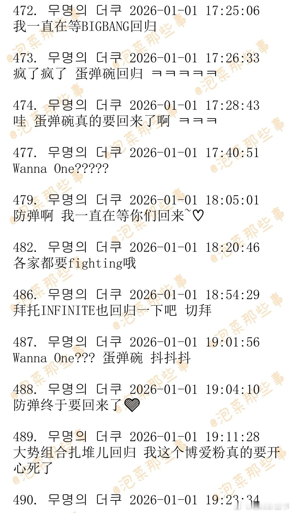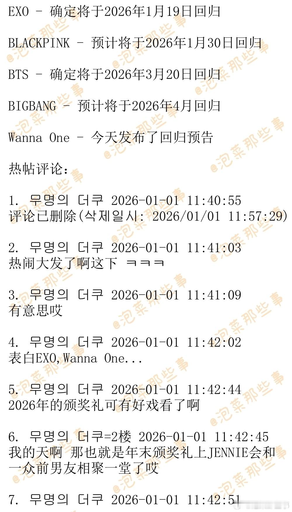 🔥🔥韩网500楼热帖评论翻译🔥🔥令人不敢置信的2026年爱豆回归阵容及日期EXO-确定将于2026年1月19日回归BLACKPINK-预计将于2026年1月30日回归BTS-确定将于2026年3月20日回归BIGBANG-预计将于2026年4月回归Wanna One-今天发布了回归预告wannaone官宣2026年重组cr.theqoo