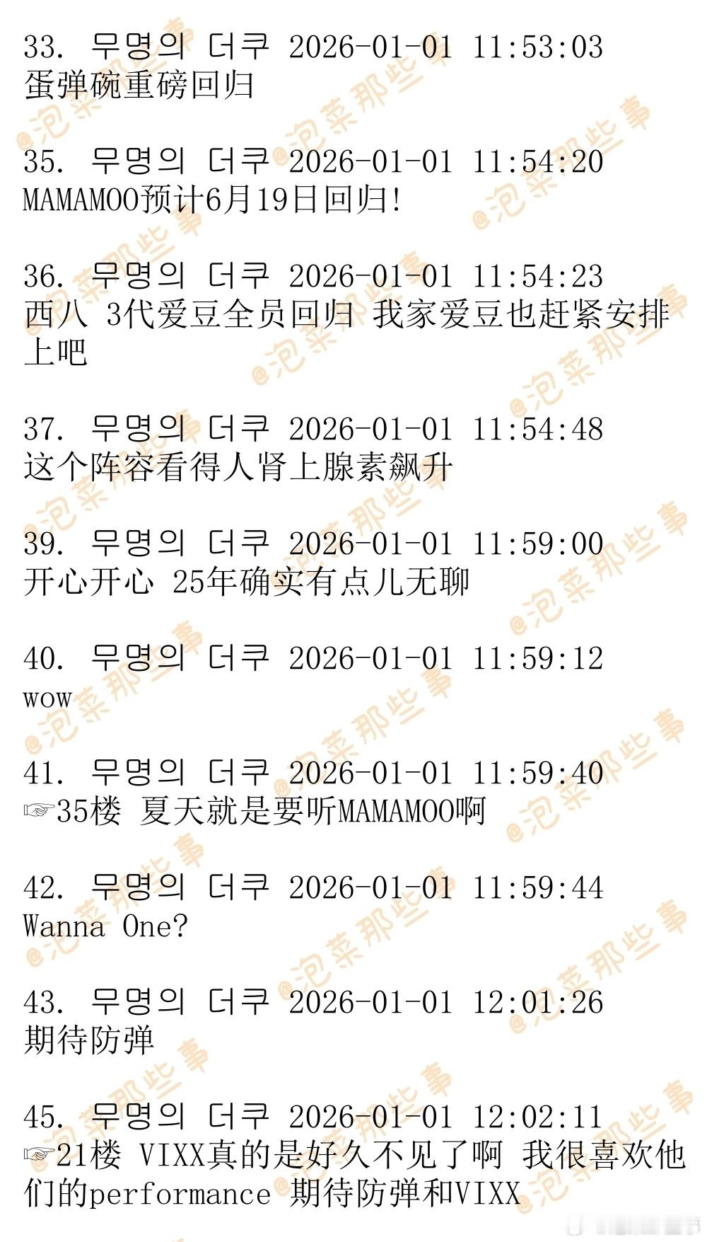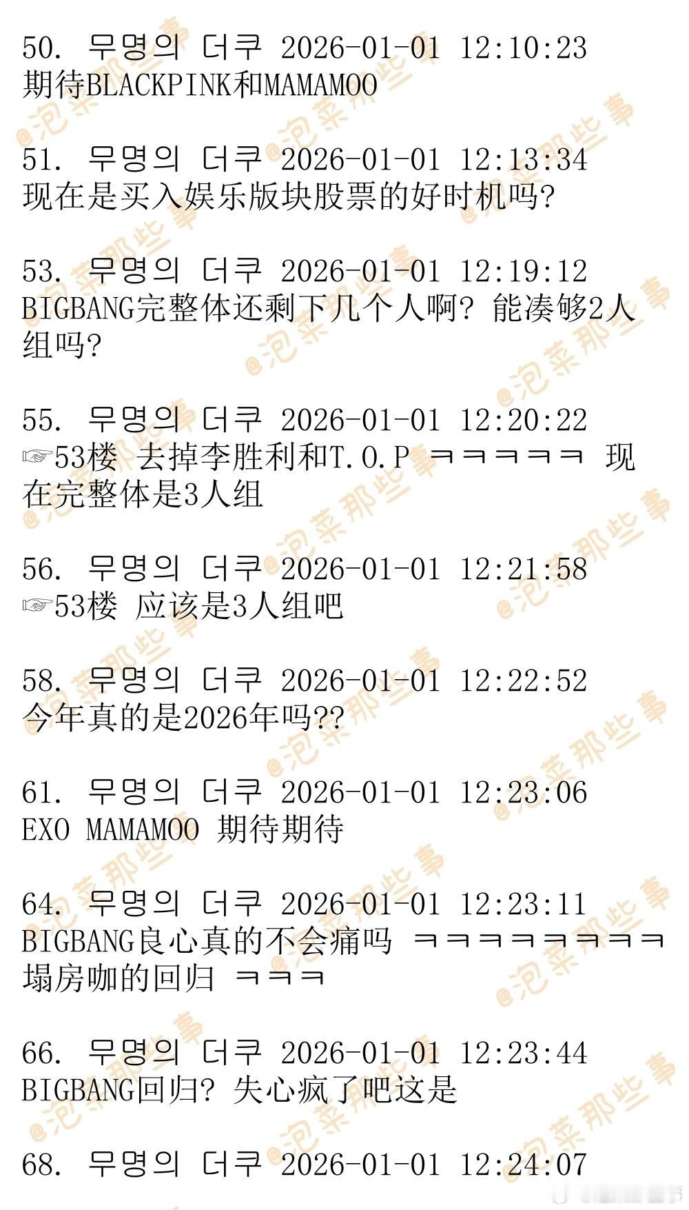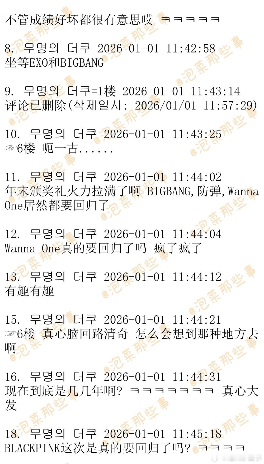 🔥🔥韩网500楼热帖评论翻译🔥🔥令人不敢置信的2026年爱豆回归阵容及日期EXO-确定将于2026年1月19日回归BLACKPINK-预计将于2026年1月30日回归BTS-确定将于2026年3月20日回归BIGBANG-预计将于2026年4月回归Wanna One-今天发布了回归预告wannaone官宣2026年重组cr.theqoo