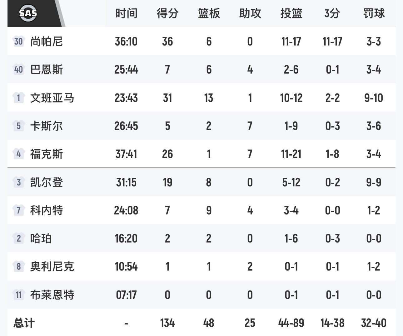 杯赛决赛重演,马刺有惊无险,134-132击败尼克斯结束两连败。文班亚马31分13篮板并遭遇膝盖受伤,尚帕尼独得36分。
