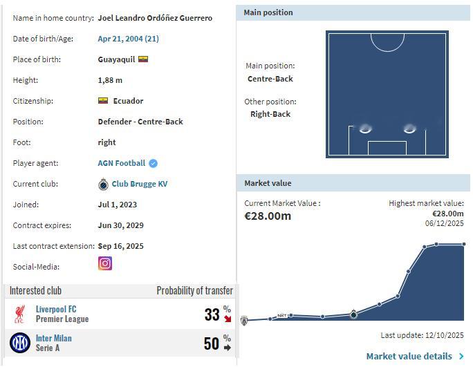 厄瓜多尔体育媒体 Bolavip 透露,切尔西与国际米兰此前均对乔尔·奥多涅斯表达了兴趣,但蓝军已退出谈判,利物浦在争夺战中处于领先地位。布鲁日为这位后卫的标价约为4000 万欧元(约合3500 万英镑),若转会成行,他将成为比利时联赛史上转会身价最高的球员之一。
