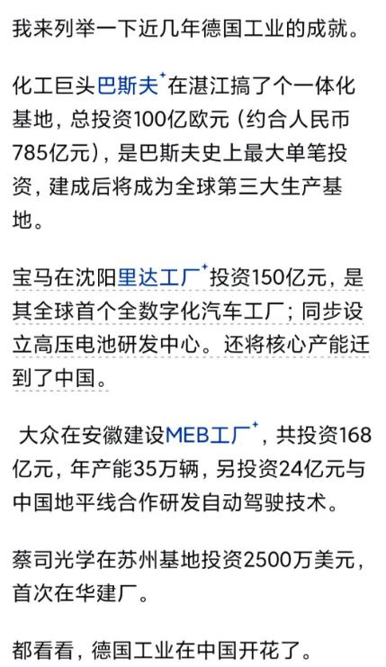 德国企业去中化是必然的! 德国企业来华,早就成为了德国公认的事实,但凡有点追求的德国企业,能够自己来华生产,那就保住了血脉。而那些中小型的德国企业,就盼着被中国的企业收购,然后继续在德国运营,或者说是搬到中国生产,保留德国的品牌,这也算是另一种延续。 不管咋说,中国人对德国人的好感,在欧洲所有国家里面,应该是比较出众的。而且咱们这边给英法德三国起名,也是很有水平。英国代表英武之国,法国代表法纪严明之国,德国代表有德之国。 德国企业在中国经营几十年,还是因为早年的大众汽车,在国内发展到了巅峰状态。后续大量的德企来华经营,发展得更为庞大。德国企业的严谨,加上大陆庞大的市场,造就了德国企业的庞大。 所以德国在欧洲混乱之际,大量企业纷纷来华,已经成为事实。虽然德国政客和德国媒体,喊着要多元化,不要都跑到中国投资,也要去其他国家投资。但好像这种提醒和反对,在某一层面是鼓励和支持的意思,反正越是反对,来的就越多,是不是故意说的反话,博主也不清楚。 德国企业也不是没去其他地方投资,去美国容易被犹太人吞了,去印度就被印度政府给吞了,去非洲别提了,去亚洲其他国家,那市场太小。所以德国企业绕了全世界,才发现只有中国这个地盘是最适合德国企业发展,所以扎堆来华,也就成为必然。
