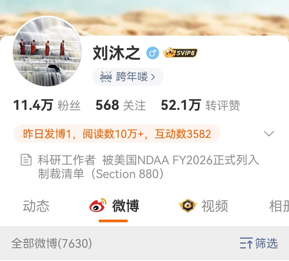 我科研工作者刘沐之12月29日被美国2026财年国防授权法案宣布制裁,短短两天个人粉丝直接涨了四万。正如刘沐之自己所说,这是他个人科研生涯的顶峰和一生的骄傲。今后,刘沐之有我们当“靠山”,事业肯定会更上一层楼。而形成鲜明对比的是,美国人被中国政府制裁,胖奥变瘦子。