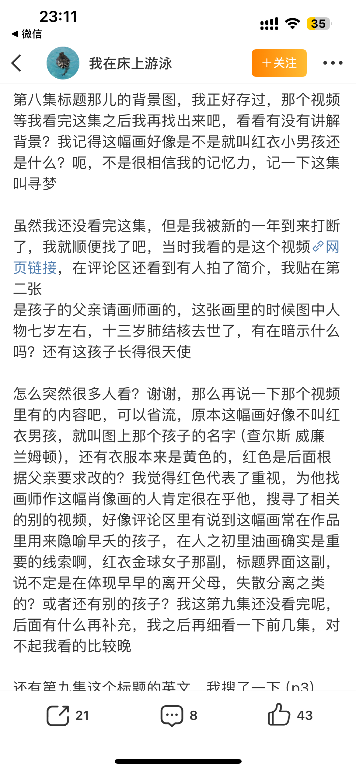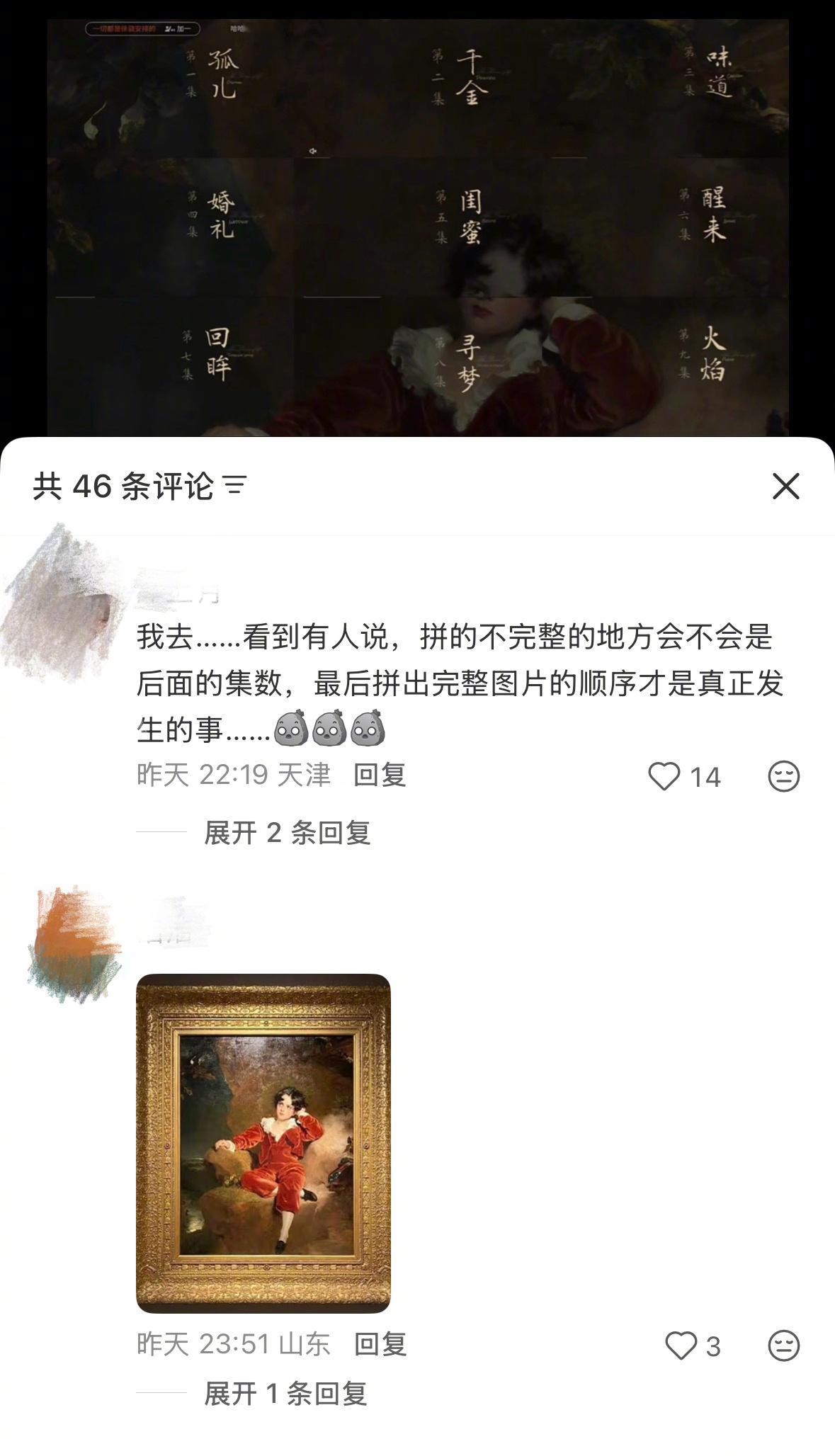 人之初片头细节藏这么深我就说跟着这群网友追剧是享福来的,人之初片头居然能拼成《红衣男孩》这幅油画,这么细节的内容都能发现,一个个真是显微镜式追剧!这幅画讲的是童年的纯真和脆弱,还带着点生命易逝的感觉,不正好戳中高风的童年吗?小时候缺亲情又迷茫,但没和妈妈分开时,他应该也是像画里男孩一样纯粹又脆弱的样子~更绝的是颜色!画里本来该是黄衣,被改成了红衣,这不正好对应剧里的主色调吗?高风回忆里的小家、妈妈的金铃铛是黄色,国际俱乐部的灯光、女生们的衣服多是红色,连广场的狮子都是黄色的!这剧的细节真的藏得太深了,一个小小片头居然都是解密关键,越扒越有悬疑那味儿~ 值得反复细品!电视剧人之初