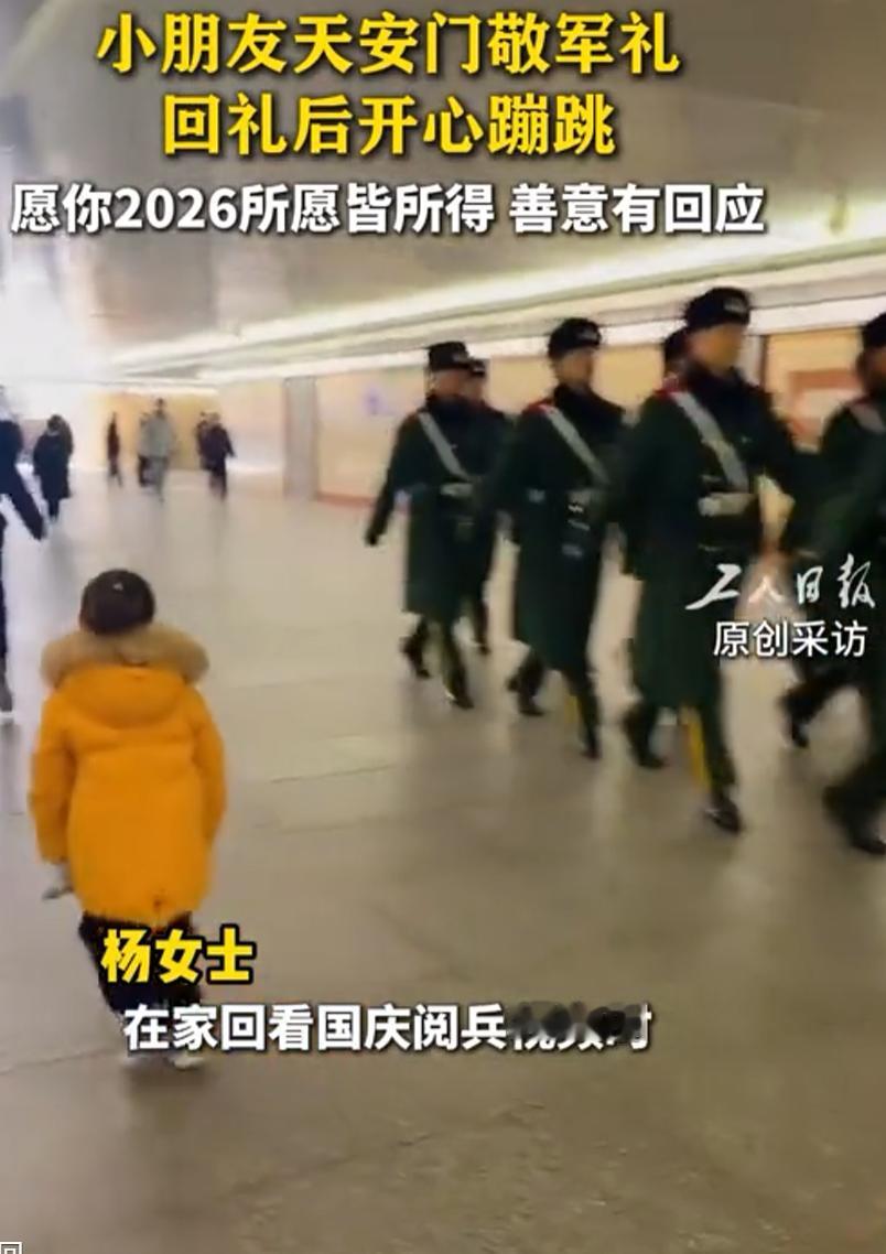 少年强则国强!陕西一3岁小朋友,回看阅兵视频后,突然说要去天安门,父母满足了他的希望,当看到解放军时,他突然冲过去敬礼,得到回礼以后,蹦蹦跳跳的瞬间变得超级开心,一整天都在说长大也要当解放军。妈妈坦言:非常感谢那位善良的叔叔给他回礼。 拗不过孩子这份纯粹的执着,父母索性放下手头的事,带着他跨越千里,从陕西奔赴北京,只为圆孩子一个心愿,谁也没想到这场说走就走的旅程,不仅让孩子见到了心心念念的天安门,更上演了一幕双向温暖的画面,也悄悄在孩子心里种下了一颗爱国的种子。 抵达天安门广场后,小家伙眼睛里满是好奇,东瞧瞧西看看,目光却总在搜寻着什么,当看到身着军装的解放军叔叔时,他瞬间来了精神,原本紧紧牵着父母的小手猛地松开,迈着小短腿就冲了过去,毫不犹豫地举起稚嫩的小胳膊,学着电视里的样子敬起了礼,他的动作算不上标准,胳膊举得不够直,身板也还挺不挺拔,可那份极力模仿的认真劲儿,格外动人。 第一次敬礼时恰逢一队解放军叔叔正在行进巡逻,小家伙立定站好,认真地敬着礼,满心期待能得到回应,但巡逻队伍始终保持着整齐的步伐向前行进,没有一人停下脚步,也没有人转头回应。 小家伙没有气馁,只是呆呆地望着队伍远去,他还不懂这不是解放军叔叔无视他,而是部队有着严格的军纪,行进途中不能随意互动,所有礼节都有明确的规范要求,这是军人刻在骨子里的纪律意识。 这份小小的插曲并没有打消孩子的热情。他蹦蹦跳跳地跟着父母继续在广场上走动,很快就又遇到了一位正在执勤的解放军哨兵,哨兵身姿挺拔巍然屹立在岗位上,小家伙再次停下脚步,没有丝毫犹豫,又一次认真地举起了小手,敬上了一个不算标准却无比真诚的礼。 这一次他的心意被稳稳接住了,那位执勤的哨兵注意到了这个小小的身影,没有因为他只是个三岁娃娃就敷衍对待。在确认不影响执勤任务后,哨兵先是稳稳摘下手上的手套,随后郑重地抬起右臂,向小家伙回了一个标准到无可挑剔的军礼。 这个摘手套的细微动作,藏着军人的严谨与尊重,是对待他人最郑重的礼仪,也是给孩子最温柔的回应,得到回应的那一刻小家伙瞬间乐开了花,刚才一本正经敬礼的模样瞬间破功,蹦蹦跳跳地转了好几圈,满心的喜悦都写在脸上。 他转头扑进父母怀里,叽叽喳喳地分享着自己的开心,从那以后一整天都在念叨着,长大了也要当解放军,要像叔叔一样威风,那份发自内心的满足与憧憬,是任何玩具都给不了的。 孩子的妈妈用手机完整记录下了这温馨的一幕,发到网上后引发了不少共鸣,她坦言特别感谢那位善良的解放军叔叔,愿意停下脚步认真回应孩子的敬礼,这份温柔与尊重,给孩子的童年留下了珍贵的回忆。 对一个还没上幼儿园的孩子来说,“爱国”或许是个模糊的概念,但他懂得崇拜帅气的解放军,懂得用敬礼表达敬意,这场简单的互动,远比千言万语的说教更有力量。 行进队伍的严守纪律,让孩子看到了军人的威严,哨兵的温柔回礼,让他感受到了军人的柔情,一刚一柔之间,孩子对解放军、对家国的热爱,悄然生根发芽。 所谓少年强则国强,大概就是这样的模样,从一颗稚嫩的童心出发,因一份崇拜而生出向往,因一次尊重而坚定信念,这个陕西小娃娃的故事,不仅是一场圆梦之旅,更是一堂生动的国防教育课。 那颗在天安门广场种下的种子,在温柔与尊重的滋养下,未来终将长成顶天立地的力量,支撑着他成为自己向往的模样,也让爱国的情怀代代相传。