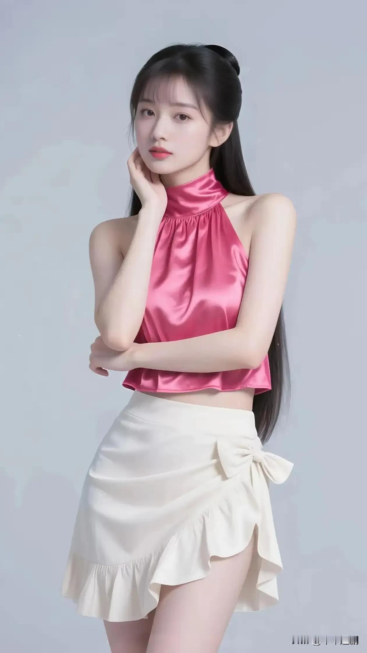 玫红缎面挂脖衫配米白荷叶裙,撞色穿搭美出甜辣氛围感~