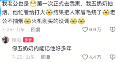 我老公也是第一次正式去我家,我五奶奶抽烟,他忙着给打火,结果把人家眉毛烧了,老公不抽烟,火机刚买的没调