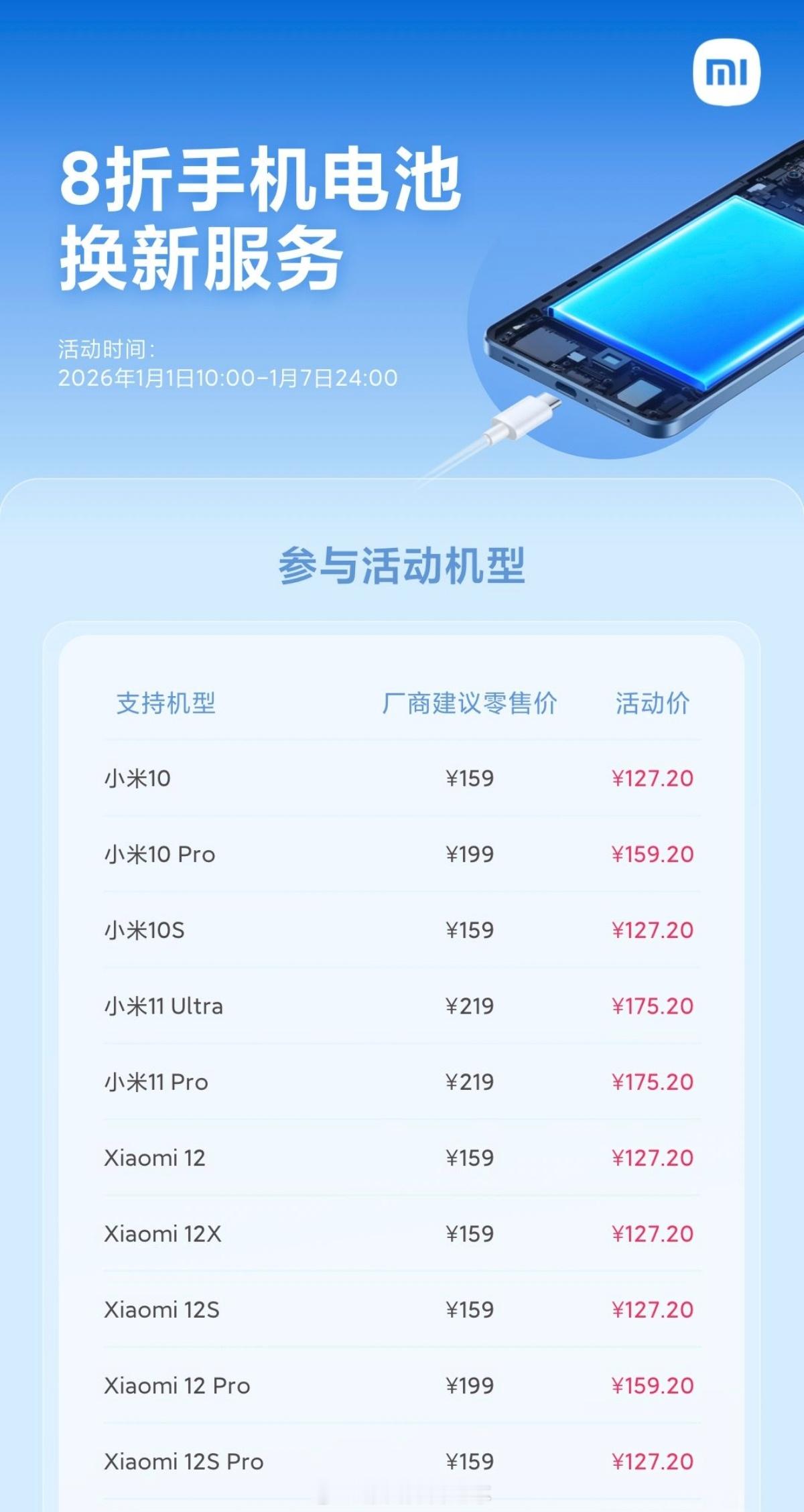 小米服务真诚奔赴 一月服务周丨54款手机电池换新79.2元起。有大家需要的么?👀小米服务