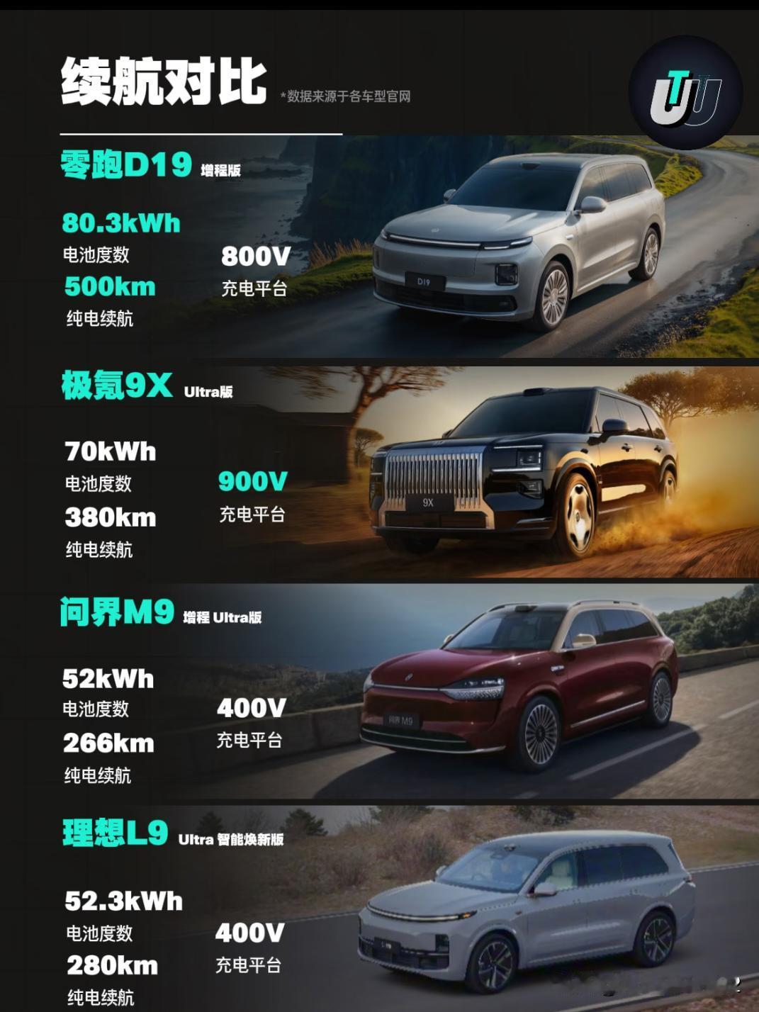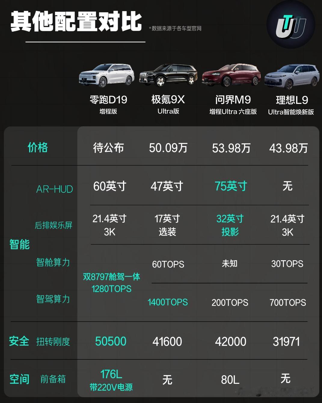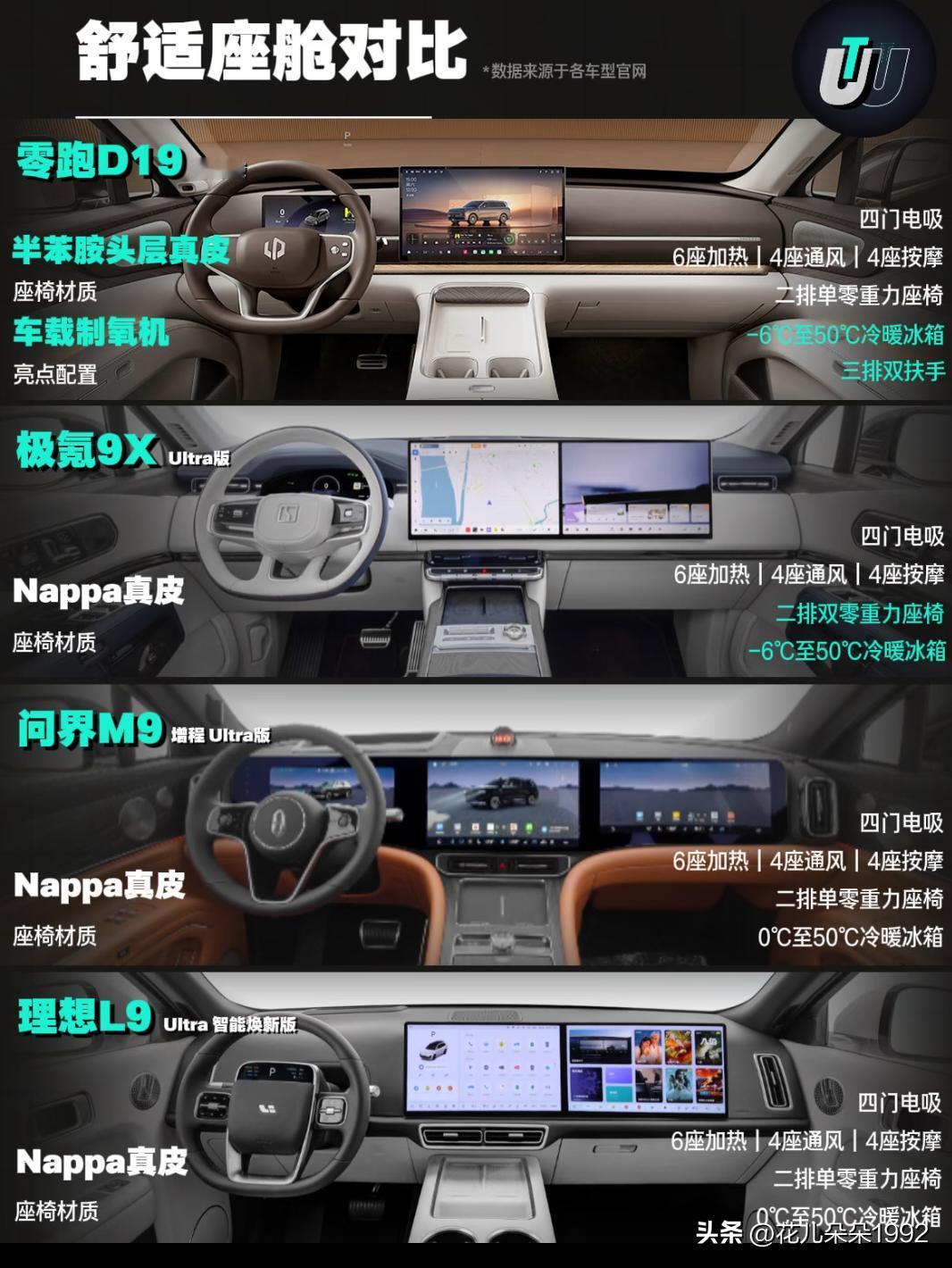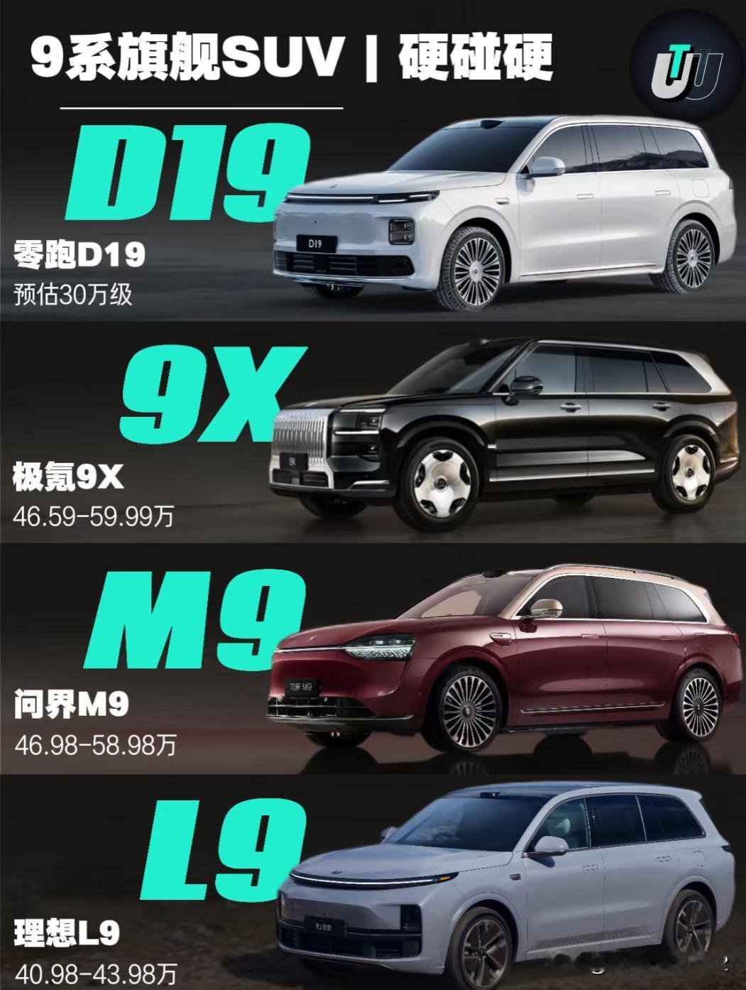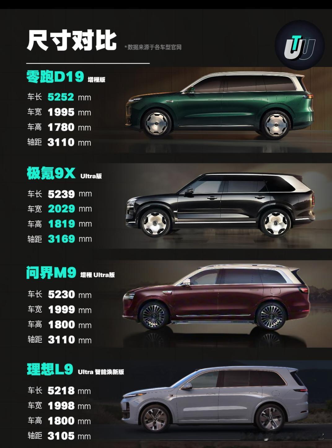 年终盘点,9系旗舰SUV硬核对比! 要说盘点今年的车圈话题,绕不开9系旗舰六座SUV。梳理了4款热门车型,硬核对比下每款车不同的产品取向。 其中D19和M9有纯电和增程,由于增程一般是销量主力,咱们这次统一对比增程/混动版本,搬板凳坐好! 1.尺寸方面 4款车的车长都超5.2米,轴距超3.1米,妥妥的全尺寸旗舰体量。D19车身更长,为5252mm,此外宽高和轴距方面,9X均更突出一点。 外观上都有极具辨识度的设计语言,而更能彰显豪华感的镜面大饼轮毂,只有D19和9X配备。 在“玩灯”这项上,只有D19和M9同时配置百万像素投影大灯和交互灯幕,科技属性更高,应用场景更丰富。 2.续航方面🗺️ 除9X为插混外,另外3款车均为大电池增程;但电池度数竟然相差28度,D19的80.3kWh电池,纯电续航高达500km。参考80度电的纯电车价格,确实有点离谱了。城市通勤当纯电车用,一周一充,节假日远途自驾,也不担心一家人等着充电。 D19同时配置800V超充平台,9X为900V;另外两款车的400V平台估计要等改款换代了。 3.驾控方面🛞 均为四驱,但仅D19和9X为双矢量电机,百公里加速为4秒级。除了快当然还得稳,D19和9X配有双轮爆胎控制,在极端车况下稳护全车安全。 4.舒适方面💺 冰箱彩电大沙发不仅要有,还得要好。 D19座椅使用半苯胺头层真皮,这个含金量可能知道的人都少吧;其他均为Nappa真皮。除9X二排为双零重力座椅,其他均为右侧单零重力座椅。 不同车型在对座舱的舒适性上也都有不同的亮点配置,9X有后排旋转座椅(需选装),M9有后排32英寸的巨幕投影,D19有车规级制氧机,这带一家人去川西自驾也会更从容吧。 细节上,D19的B柱拉手,二三排电动遮阳帘,三排双扶手,航空阅读灯等配置也体现出旗舰产品的面面俱到。 9系旗舰SUV,把车身尺寸做大容易,把用料堆满容易,但做到“豪华平权”是真不容易。好的产品要服务于更多的人,30万级的零跑D19或许找到了自己的好机会,你觉得呢?