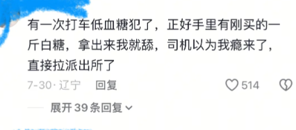 有一次打车低血糖犯了,正好手里有刚买的一斤白糖,拿出来我就舔,司机以为我瘾来了,直接拉派出所了