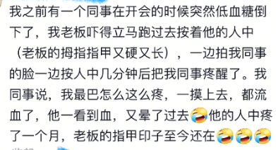 我之前有一个同事在开会的时候突然低血糖倒下了,我老板吓得立马跑过去按着他的人中(老板的拇指指甲又硬又长),一边拍我同事的脸一边按人中几分钟后把我同事疼醒了。我同事说,我最巴怎么这么疼,一摸上去,都流血了,他一看到血,又晕了过去,他的人中疼了一个月