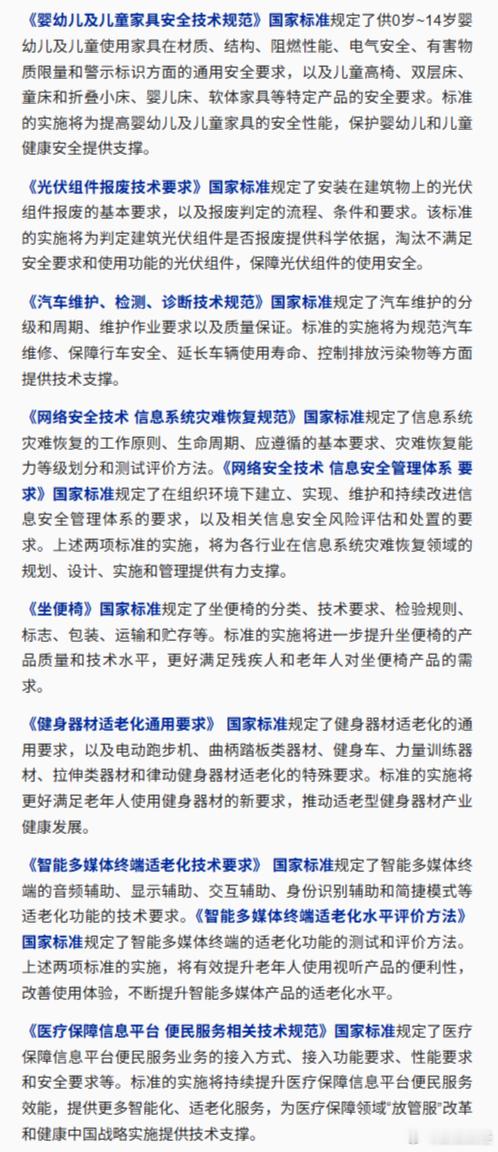 【1月1日起将实施一批重要国家标准】记者从国家标准委了解到,2026年1月1日起,婴幼儿及儿童家具安全、光伏组件报废、汽车维护检测和诊断、信息系统灾难恢复、信息安全管理体系、坐便椅、健身器材适老化、智能多媒体终端适老化、医疗保障信息平台便民服务等一批重要国家标准开始实施,将为规范新兴产业及未来产业的健康发展、营造良好的消费环境、保障人民群众生命财产安全提供标准支撑。(央视新闻)