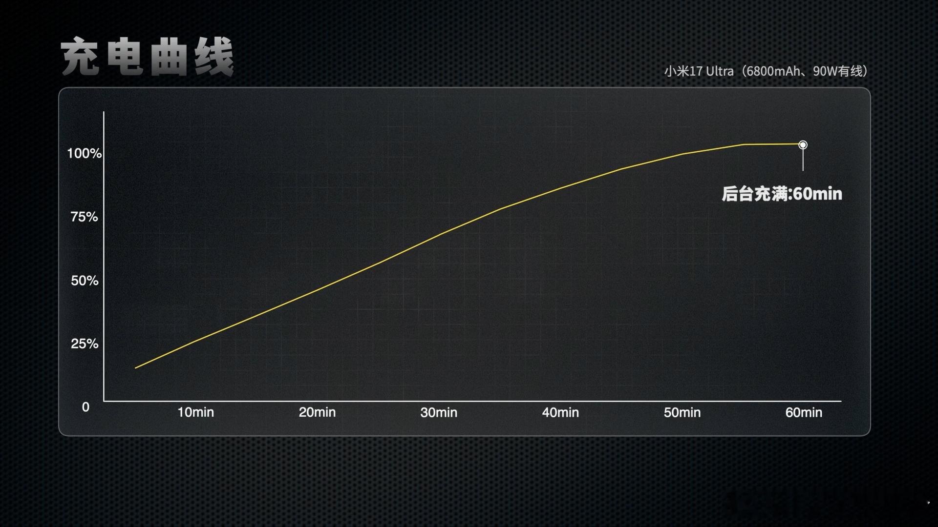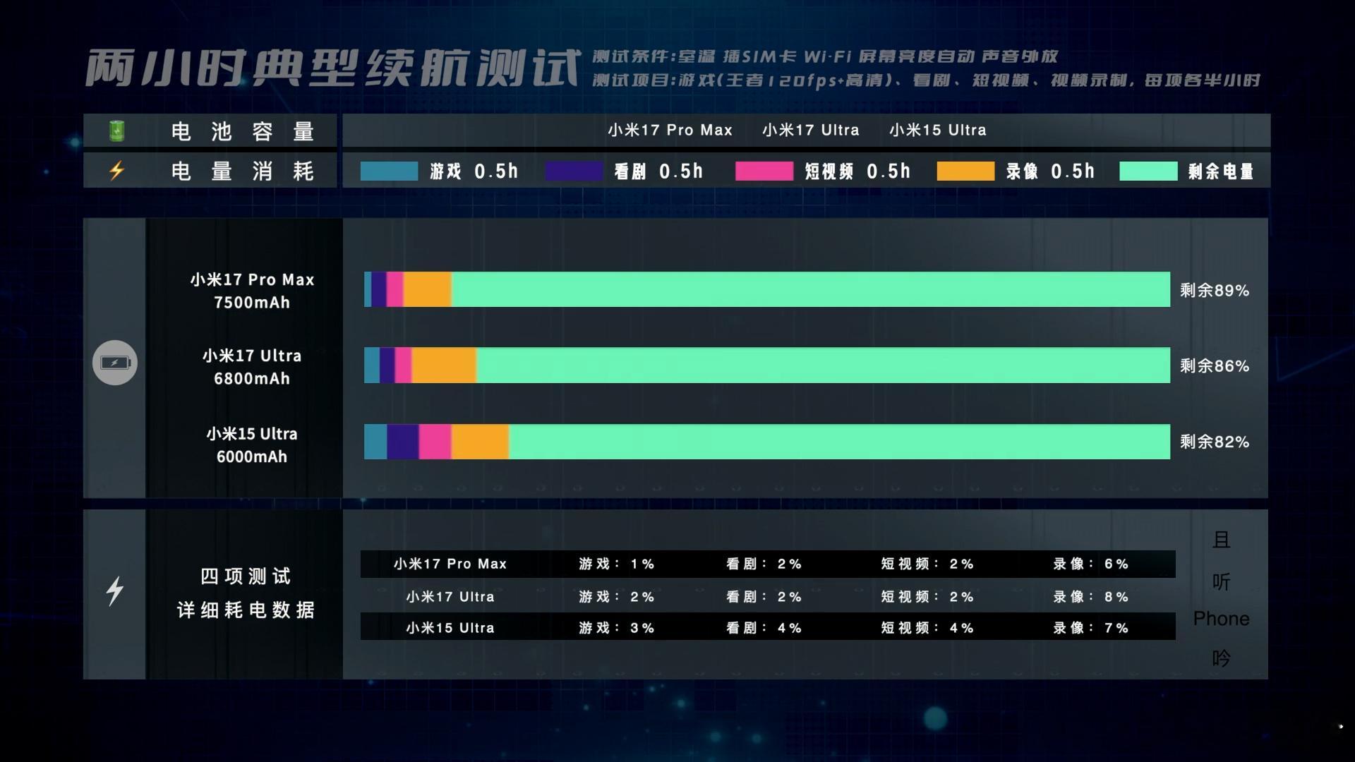 米17U电池6800mAh,相比米17PM有所减小,查了一下能量密度是882Wh/L,差不太多,还是摄像头占的空间太大了。容量大小也体现在续航测试上,两小时剩余86%,相比自家17PM,和别家最新的Pro差一些,这也是往年Ultra正常水平,不过和自家15U比还是进步明显。这里还要说一下,经过这段时间的使用,米17U的耗电很均匀,没有别家100%特别耐用,后边掉电快的情况。快充90W,充满需要60分钟,算不上快,这代米17系列都支持相同瓦数的PPS,17/Pro/Pro Max是100W ,17U是90W,三方头充速度也很快,这点体验还是挺好的。