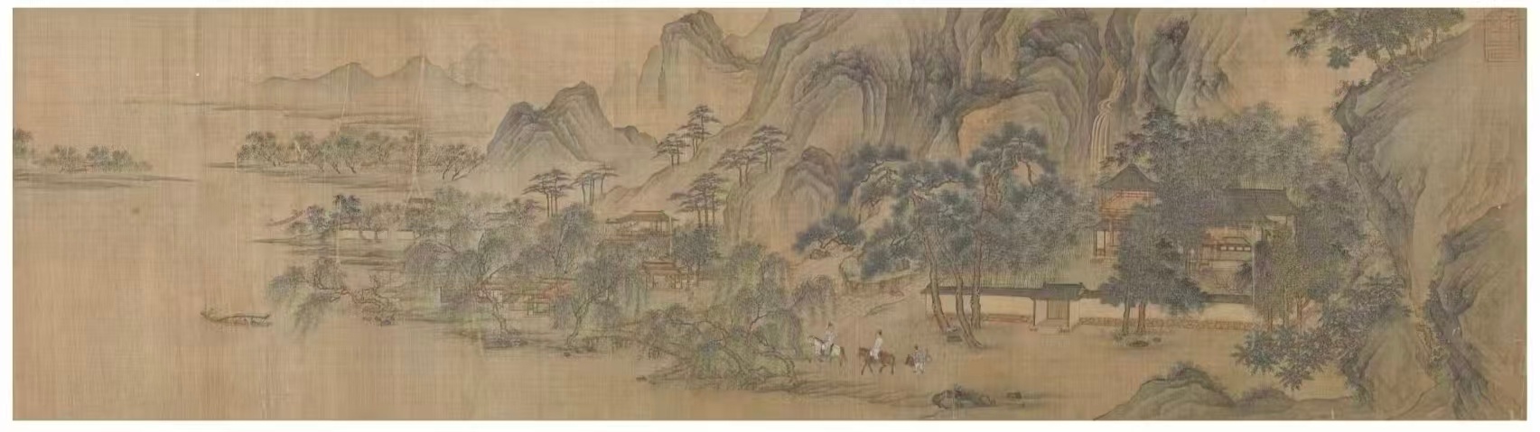 几幅图说明《江南春图》是仿作图一,两个图看上去构图完全一样。上面是仇英《江南春图》,引发巨大争议。下面和图二是唐伯虎的《江南春图》,又名《春游图》,现在美国博物馆,出现得比仇英这幅还早。图三是现场场景,AI生成。仇英和唐伯虎都是名家,不太可能画出构图一样的作品,也不会模仿对方画而不说明。因此,这两幅图里,一定有一幅是抄对方的,也可能两幅都是抄的。根据史料,艺术风格,仇英这幅图基本可以判断是仿的。不是仇英画的,而是清朝人仿了唐伯虎的图,按惯例署名仇英,当时流行这种仿制署名趣味,而仇英是人们最愿意署名的对象之一。