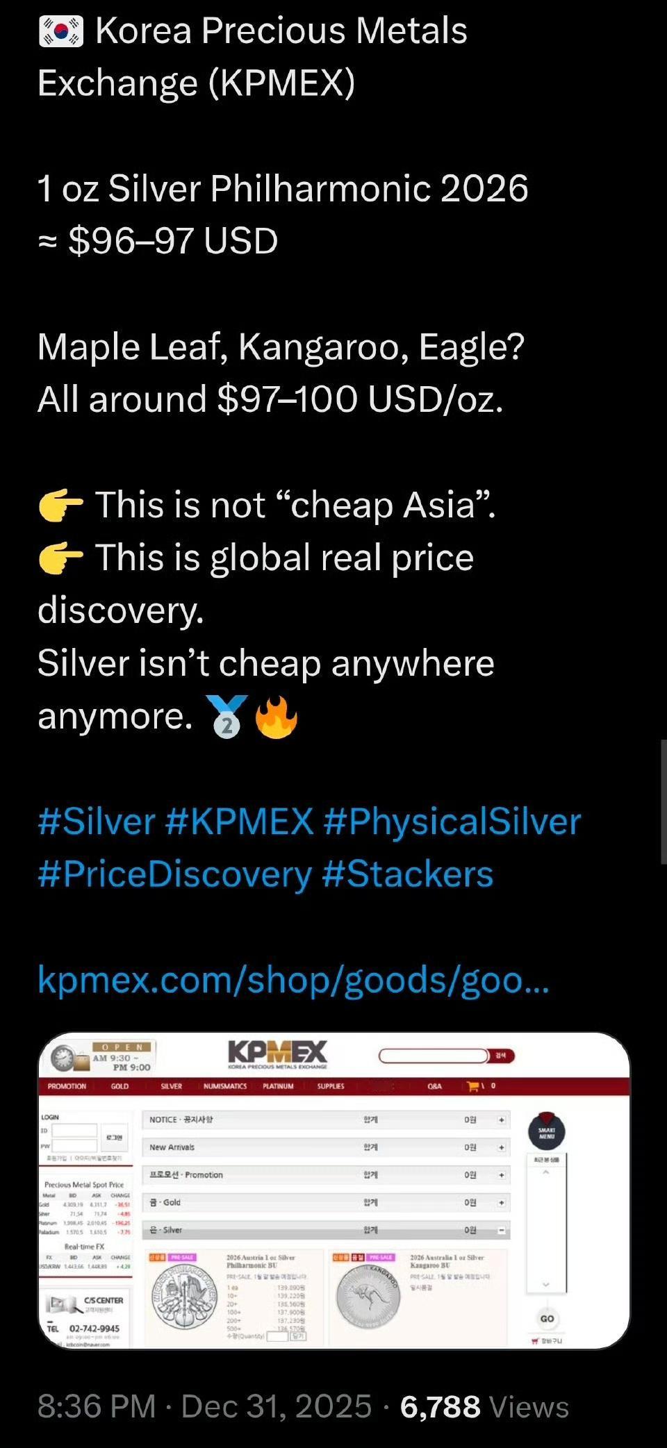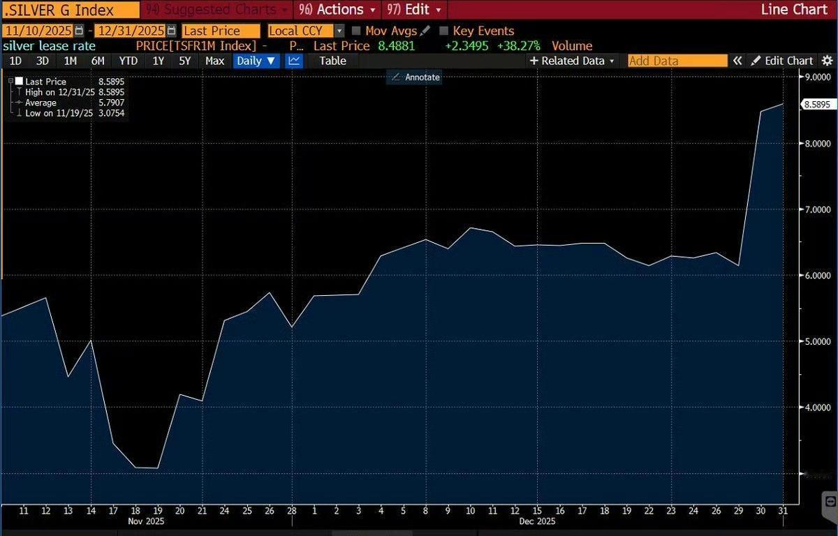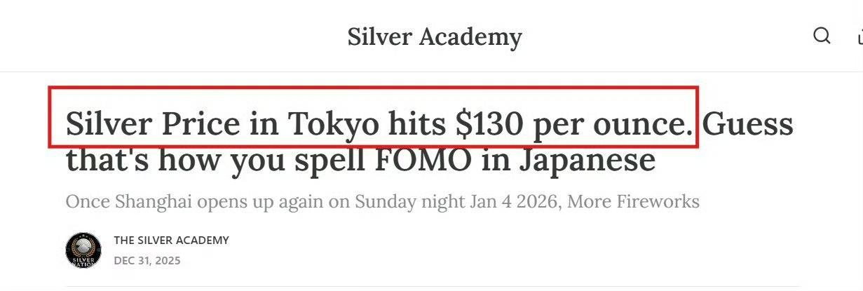 伦敦的实物白银租赁利率已上涨了8.5895% 。 白银租赁利率飙升本身就证明了,实物白银的供应非常短缺。靠纸银打压银价还能支撑多久? 东京银价已经是130美元,见图2。 图3是韩国的银价。 图6显示,2025年,彭博商品指数上涨了+11.1%,为2022年以来最佳一年,主要贵金属大幅上涨。