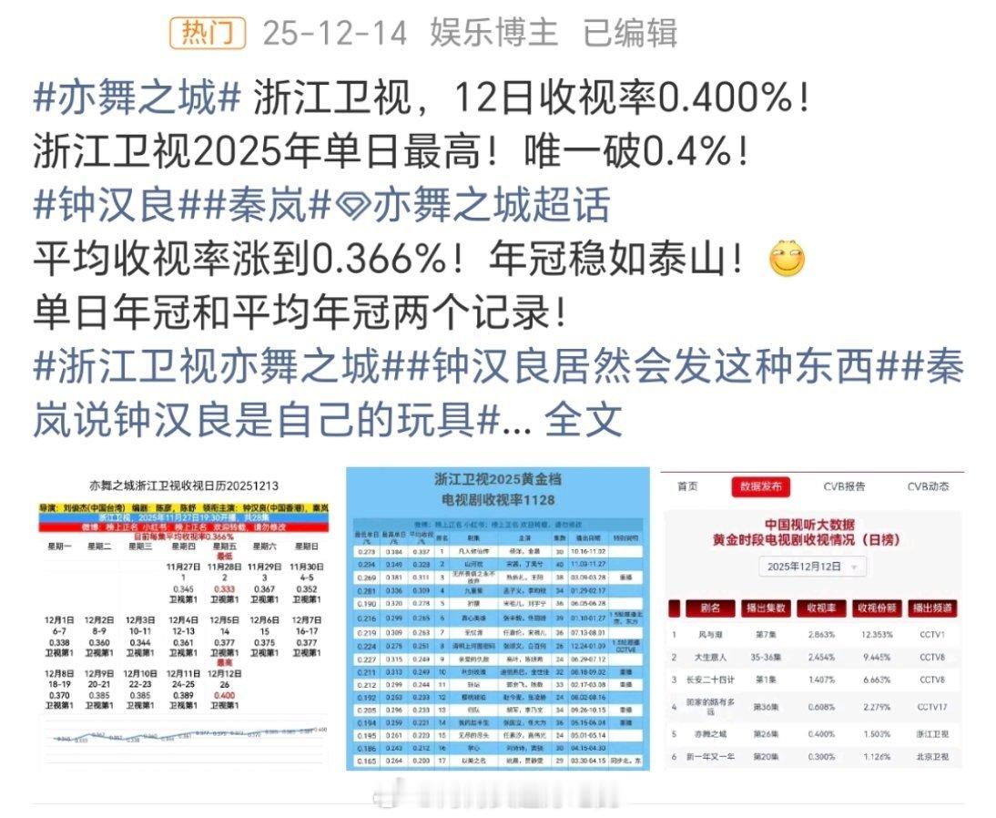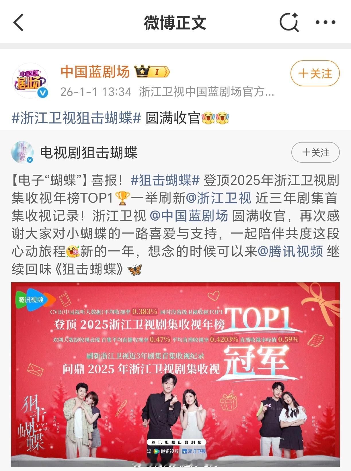 钟汉良的亦舞之城和周柯宇的狙击蝴蝶谁是浙江卫视年冠,豆瓣开始掰头了因为cvb统计数据是15号,那时亦舞之城已经完结,狙击蝴蝶没有完结,所以cvb 年冠给了亦舞之城;但是12月30号蝴蝶完结了cvb 更高,浙江卫视转了🦋是年冠的微博,所以两边就交流起来了