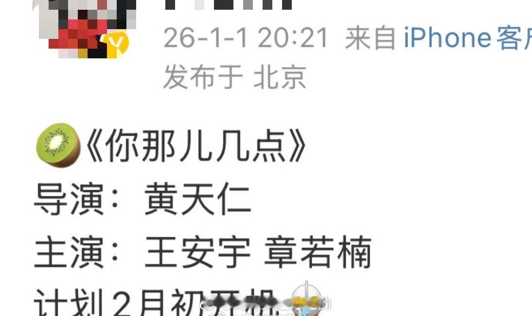 王安宇 章若楠《你那儿几点》的导演从瞿友宁换成黄天仁了,计划2月初开机。