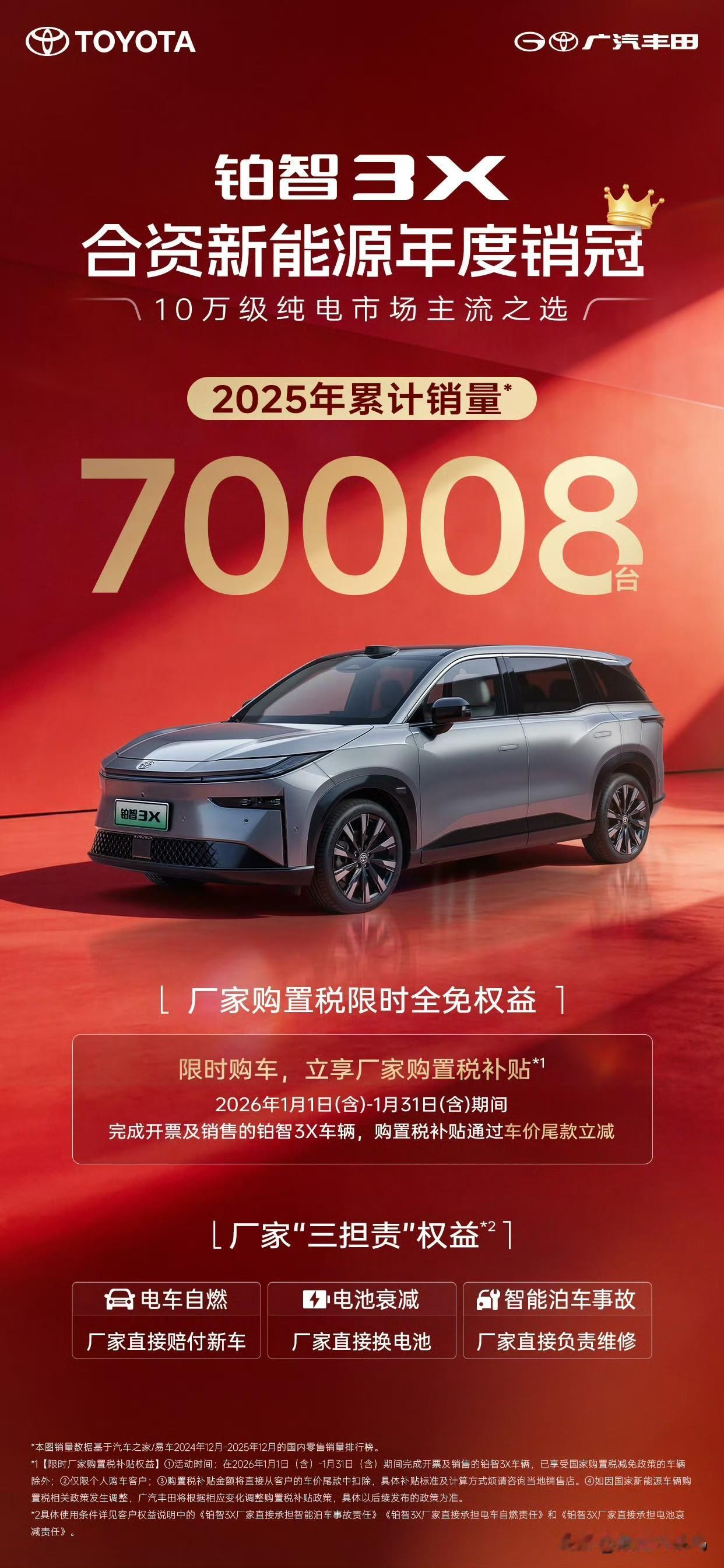 看到广汽丰田彭宝林总在微博首度披露佳绩,铂智3X真的太强了~自2025年3月上市,全年直接卖了70008台,妥妥的纯电市场顶流选手~ 能卖这么火可不是运气!丰田国际大厂品质打底,还有行业第一梯队的激光雷达智驾,开着跟老司机似的省心,OTA还能越用越聪明;安全感更是拉满,“三双一冗余”安全设计,双制动、双电源加交叉驻车控制,还有物理紧急下电开关,极端情况也能稳稳拿捏,再加上600家网点售后,用车完全不用慌、它的空间也超实用,座椅放倒能当大平层,家用通勤都合适,10万级价位性价比直接拉满~ 最最最重要的福利时刻来啦,现在入手铂智3X权益真的超多,要知道它可是行业第一个搞2026年购置税全额补贴的,1月份购车厂家直接兜底,分文不用花~ 而且厂家“三担责”保障延到2026年底,年内买车均享,早买早享受