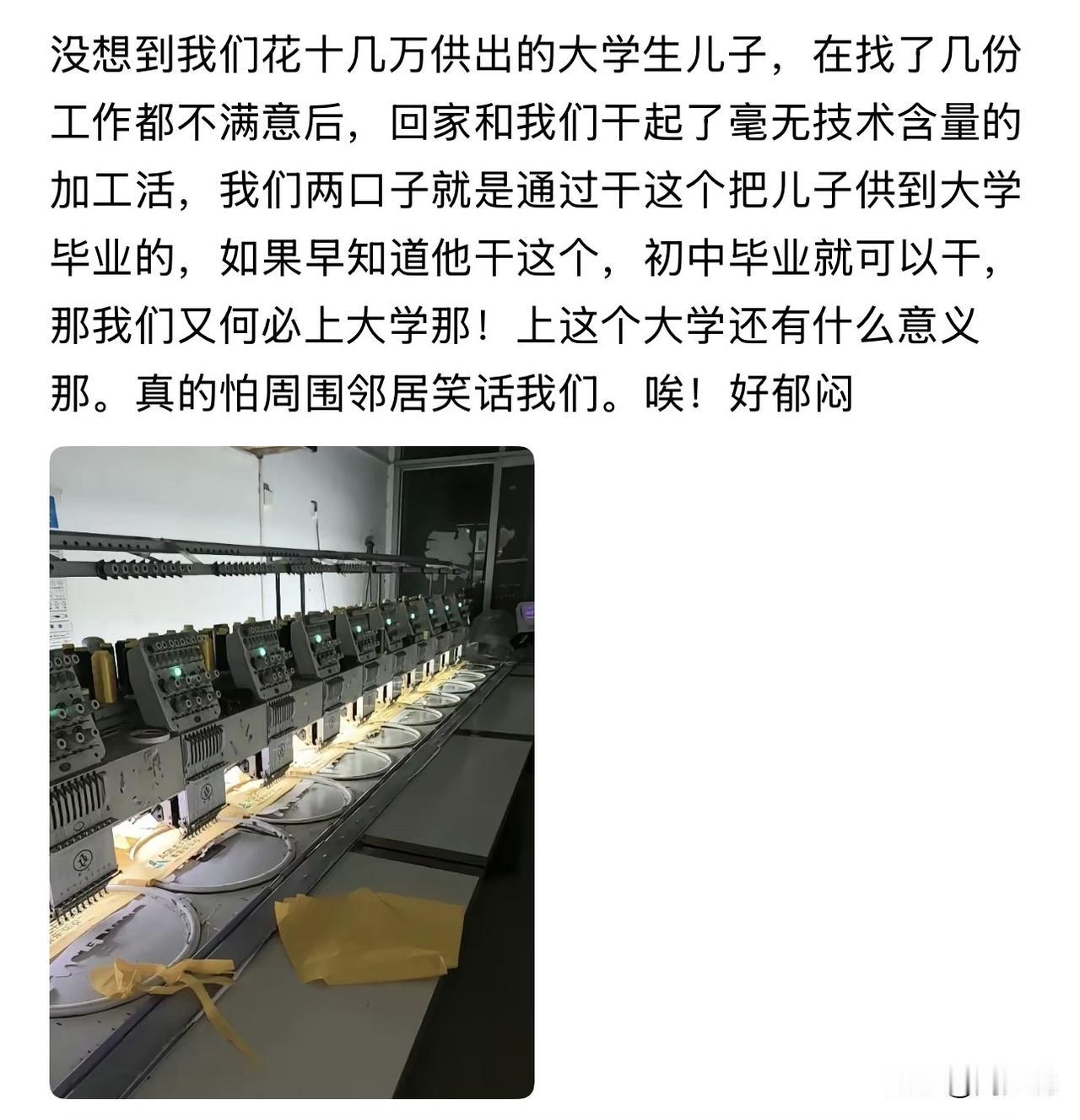 扎心!夫妻砸十几万供出大学生儿子,毕业后竟回家干体力加工活,父母崩溃:“早知这样,何必读大学!” 这是一位家长的吐槽,夫妻俩靠日复一日的苦力加工,省吃俭用把儿子供到大学毕业,满心期待能逆袭。可结果是,儿子毕业后找了几份工作都不满意后,回家干起了和自己一样毫无技术的加工活。 对于儿子的遭遇,夫妻俩心里五味杂陈,花了十几万供读大学,最后兜兜转转又回到原点,不得不质疑读大学的意义,更怕邻居知道后笑话。 此事引发网友热议,有人感慨:学历成了废纸,寒门的教育投入,终究没换来想要的出路。 也有人直言:不是读书没用,是就业内卷太狠,体面的工作,早已不是一纸学历能换来的。 这事在周少看来,特别能理解这位家长的心情,此等遭遇,换做谁都可能难以接受。换句话说,这不是读书无用,而是现实的无奈。 这位家长也要明白一个事实,读大学从来不是只为谋一份光鲜工作,更是教会孩子认知、格局与抗挫力。大学四年,沉淀的是底气,不是一纸文凭。孩子放下执念回归家庭,不是认输,而是清醒。 所以,为人父母真不必纠结于旁人眼光,能养出踏实肯干、不眼高手低的孩子,已是最大的成功。比起虚名,比起那些在家躺平的孩子,孩子肯放低姿态,真的要称赞支持!#寻美三湘# #长沙新朋友#