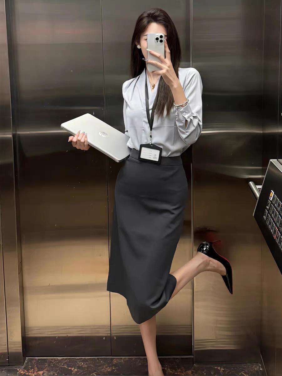 灰色职场半身裙春秋新款小个子面试直筒开叉包臀裙西装中长半裙女职场怎么穿简约高级? 职场女性都喜欢什么样的穿搭风格?