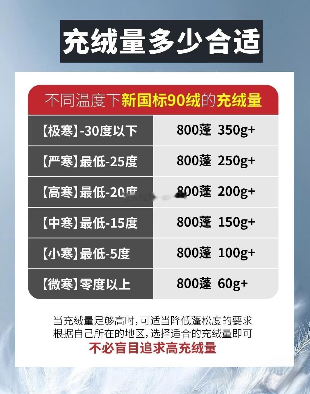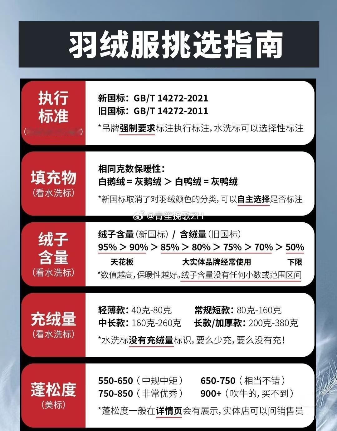 买羽绒被一定要看绒子含量羽绒服怎么选 冬天保暖不踩坑!5个核心要点速记✅ 先查吊牌标识认准新国标 GB/T 14272-2021!老国标早已作废,别被忽悠~新国标标注「羽绒种类、绒子含量、充绒量」,和老国标的「含绒量」不是一回事哦!✅ 核心看绒子含量老国标含绒量=绒子+绒丝,新国标绒子含量只算纯绒子,含金量更高!优先级:95%最佳 > 90%优良 > 80%较好 > 70%正常,低于50%直接pass!✅ 蓬松度决定保暖力蓬松度(FP)越高,锁住的空气越多,保暖性越好!70绒(400-500FP)=入门级80绒(500-600FP)=过冬级90绒(600-700FP)=酷寒级95绒(800-900FP)=最高级✅ 清洁度别忽略清洁度低=杂质多,不仅保暖差,还可能有异味、致敏!加工工艺好、原料优质、存储干燥通风,才能保证高清洁度~✅ 充绒量按场景选充绒量越高越保暖,但要结合绒子含量和蓬松度!以创世800FP鹅绒为例:100g=轻薄款(-5℃以内)170g=抗-10℃150-200g=抗-15℃180-230g=抗-20℃300g=抗-30℃💡 温度/款式对应参考:南方(0℃以上):100g+|轻薄款40-80g北方(0℃~-20℃):200-300g+|短款80-130g/常规款120-160g极寒/户外(-20℃以下):300-500g+|中长款150-250g/长款300g+生活小贴士 买羽绒被一定要看绒子含量