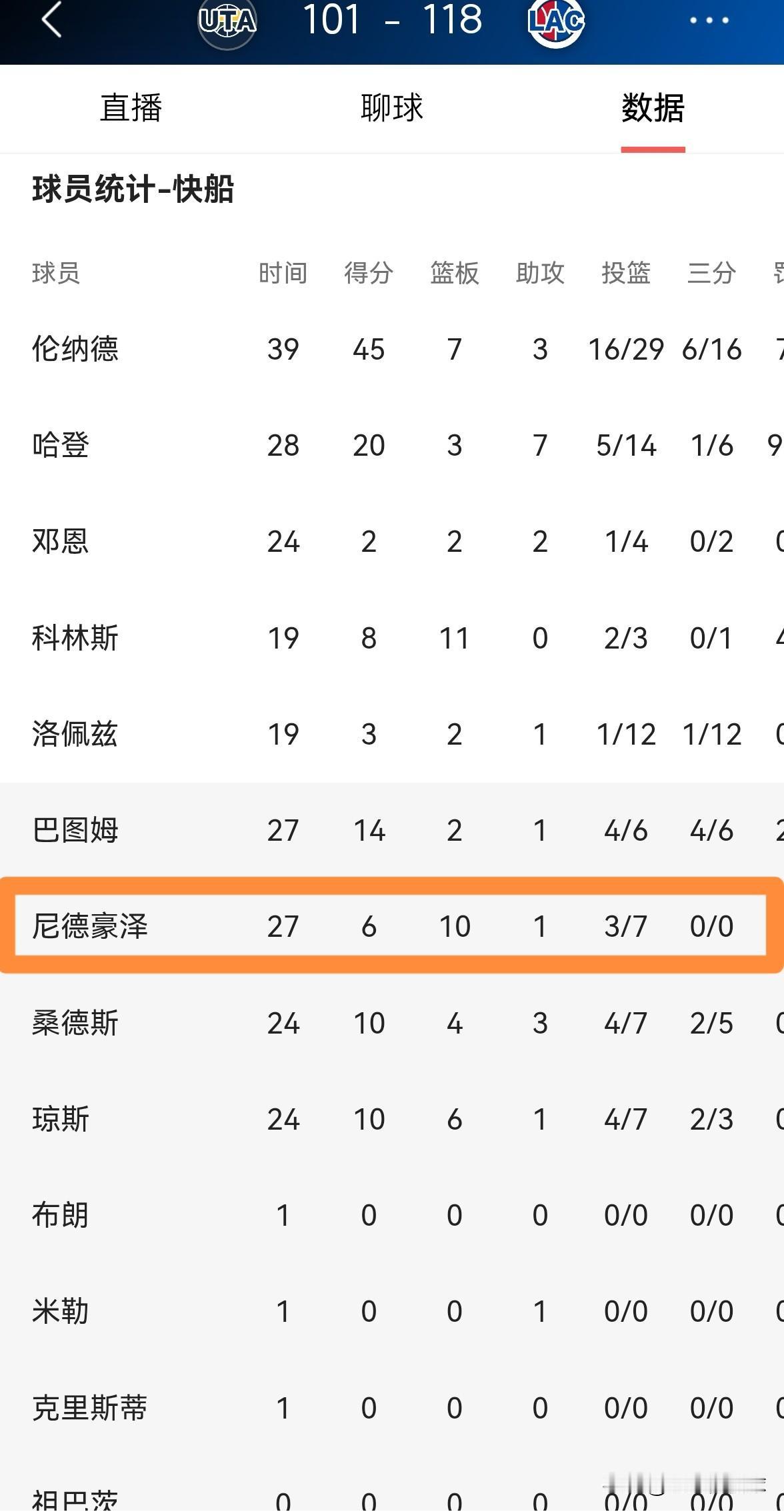 我忍不住要狂赞快船新秀尼德豪泽!在今天快船主场以118:101力克爵士的比赛中,尼德豪泽敢拼敢打,成为了球队赢球的大功臣。 全场比赛下来,尼德豪泽替补出战27分钟,投篮7中3得到6分10篮板1助攻2盖帽,他的场上正负值为全队最高的+18。 值得一提的是,本场比赛尼德豪泽拼抢到了6个前场篮板,展现出了超强积极性。在我看来,尼德豪泽一定能够在未来成为快船的内线支柱。