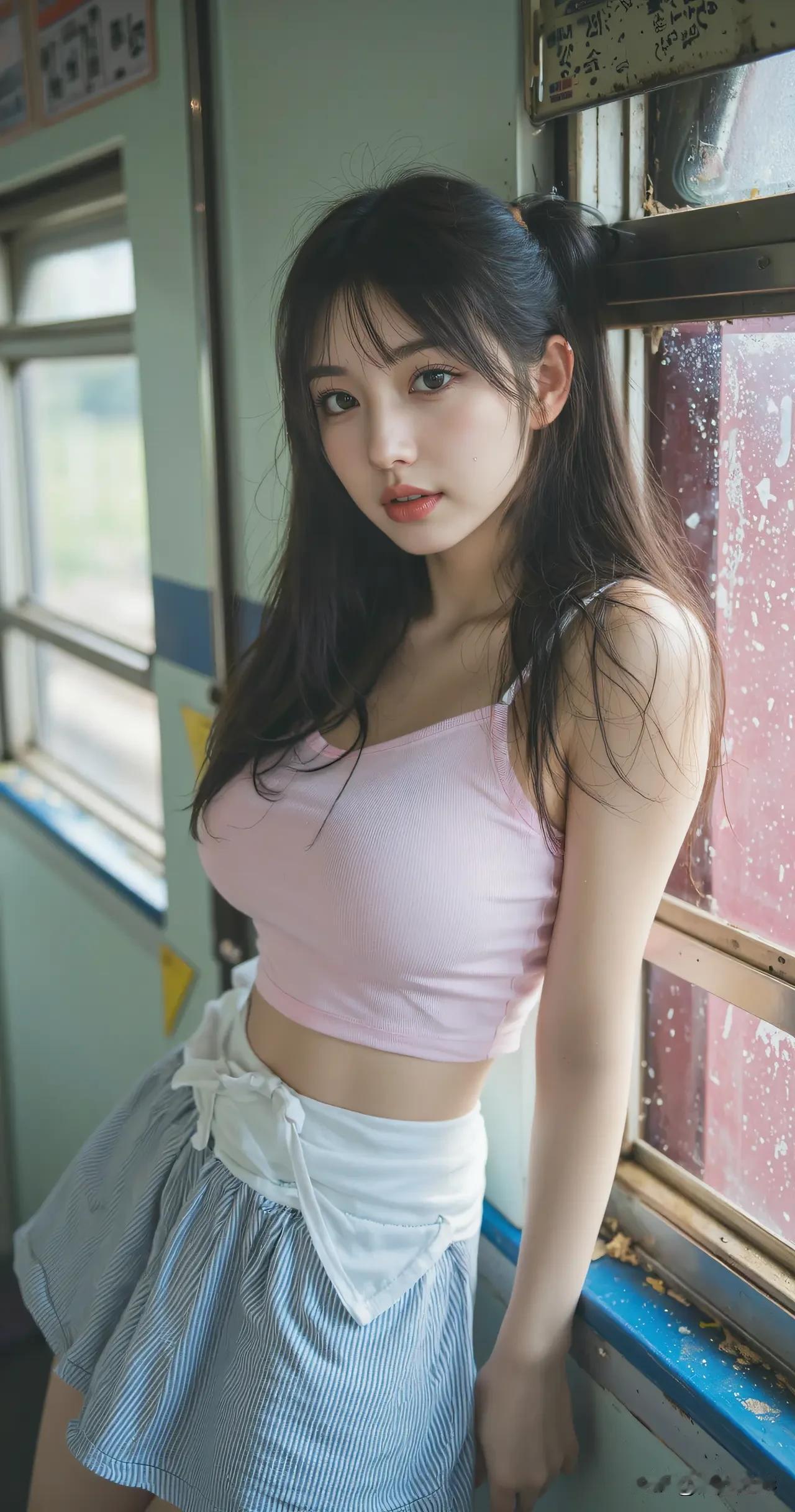 光之影 阳光明媚的午后,少女在铁轨旁微笑,草帽与白裙相映成趣,自然清新。