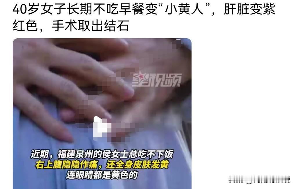 一定要引起重视。早餐是一定要吃的,早餐不仅要吃而且还要吃的营养。 近期一女子因为长期不吃早饭,结果身体都变黄了。 肝脏都变成了紫红色,眼睛都是黄色的。 而且右上腹还总是隐隐作痛。 原来是身体出现了结石啊。 这要引起重视。 最终通过手术取出了结石。 有病就得治。