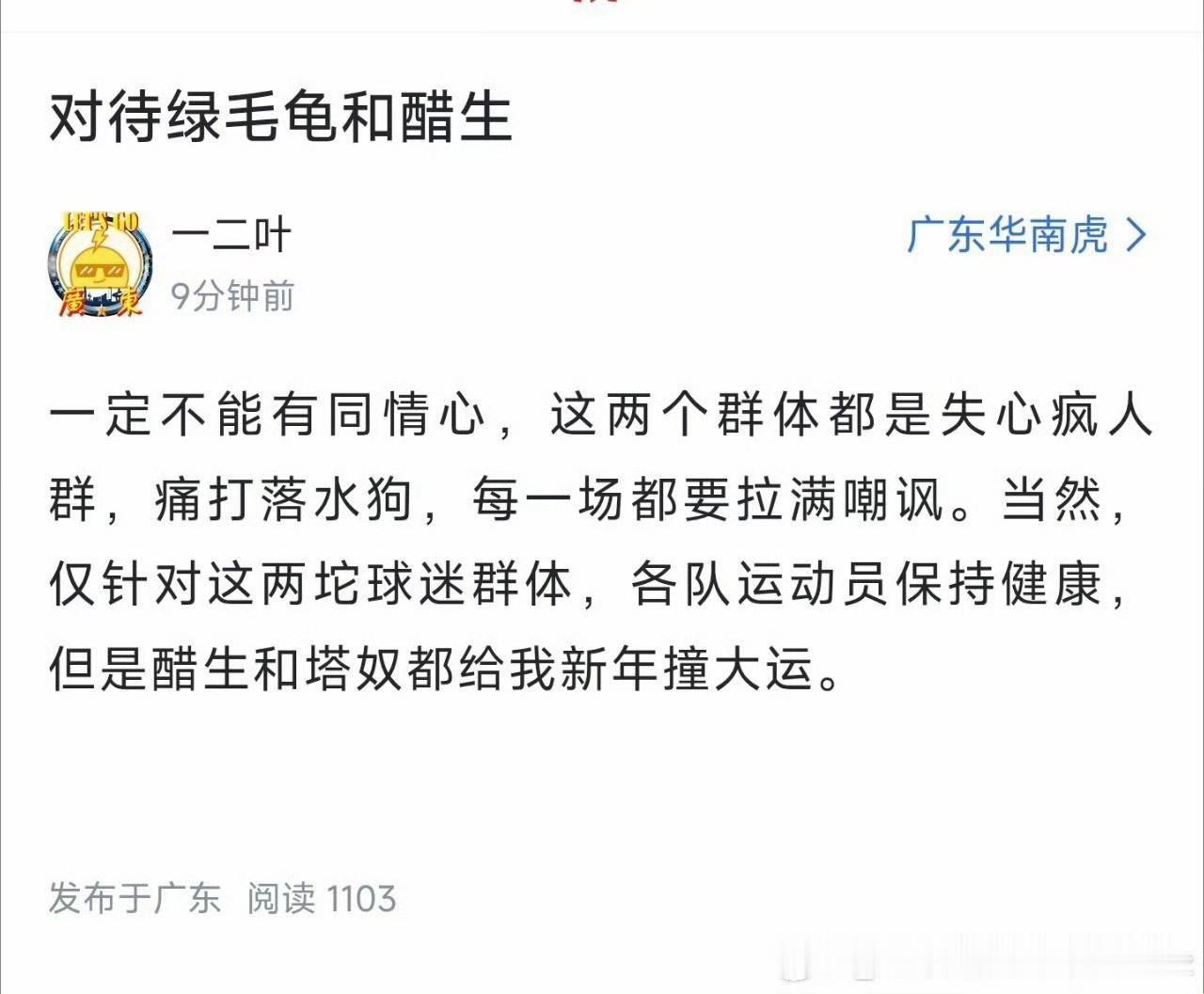 放下屠刀,立地成佛!就是送给当下广东个别球迷的至理名言。广东球迷“一二叶”在“对待绿毛龟和醋生”的话题下公然发布号令般的挑衅:“一定不能有同情心,这两个群体都是失心疯人群,痛打落水狗,每一场都要拉满嘲讽,当然,仅针对这坨球迷群体,各队运动员保持健康,但是对于醋生和奴塔都给我新年撞大运。”给全体广东球迷下达了新年的通牒,要求广东球迷围攻他们认知中的那两个球迷群。其中有一个广东球迷“逃跑隧道”跟帖“广东加油徐昕发育”关于“鸡尾和脏宁还没有复出,他们还败人品,他俩还有受得”的留言,他说“这两复出第一场就要断跟腱。”球迷都懂:绿毛龟和醋生在广东球迷心目中指的是那两支队伍。鸡尾和脏宁,又是谐的谁的名字的音。 作为广东球迷,假如还有一丝理性思维,就应当夺量自家阵营态势:奎因有伤暂停不能打,杜润旺有伤不能打,胡明轩有伤间断性比赛,麦考尔右脚二级踝关节扭伤、外侧韧带撕裂,大概率缺席第一阶段。新签约的焦泊乔和崔永熙都是断过跟腱的球员。自家的球员正在经受着痛苦,你却天天在网上像魔鬼一样,歇斯底里地咒诅别人?良知呢?道德呢?人性呢?殊不知,元旦第一天,广东球迷这种咒语就落实到了广东球员徐杰身上~跟腱没断,脚伤了。何时能打不知道。此时,有辽宁球迷站出来给广东球迷喊话:“这一桩一件,最后都会反噬到广东队员身上。广东球迷何苦发毒誓为难自己的队员呢。”真的到了戒毒嘴的时候了。再不戒,有可能还会给他自己及家里人新年带来整年的霉运!