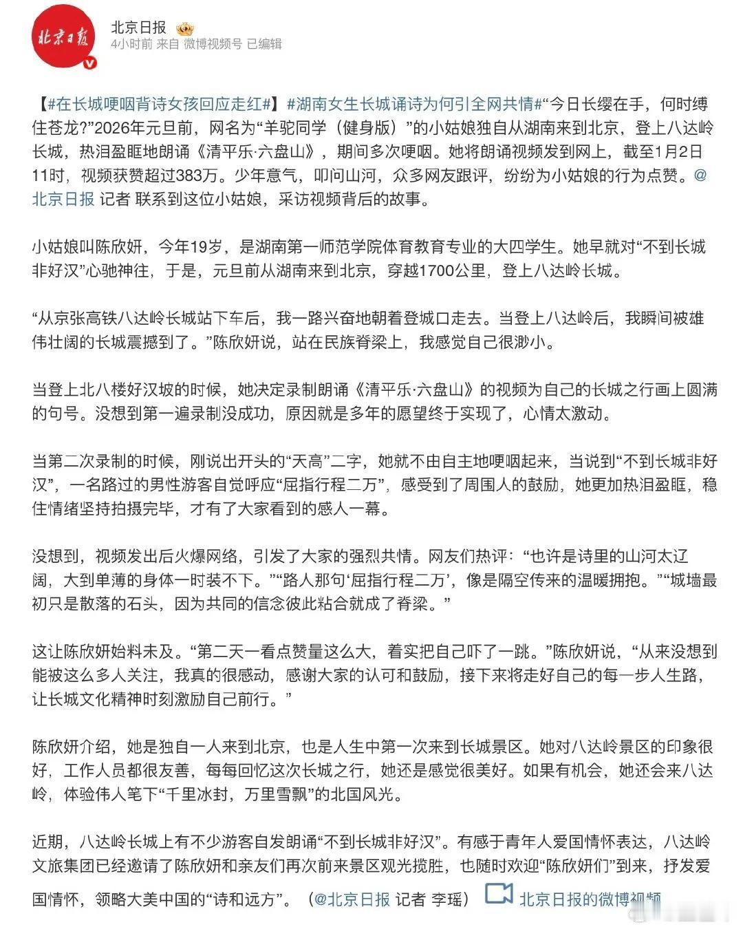 不得不佩服现在的年轻人,他们不仅有“不到长城非好汉”的决心,更有“不发抖音非好汉”的果敢。穿越1700公里,不是为了静静感受历史的厚重,而是为了在特定的地理坐标点,完成一场刚刚好的、神圣的“自拍祭典”。 文章里说,第一遍录制没成功,是因为“心情太激动”。这真是一个令人玩味的细节,当一种感动需要“重录”第二次才能达到满意的艺术效果时,这种感动究竟是来自灵魂的震颤,还是来自对短视频算法的敬畏? 那一刻,长城不是脊梁,而是巨大的环形补光灯;《清平乐·六盘山》不是诗词,是通往热门榜单的BGM。 更妙的是那名“路过的男性游客”。他精准地在那句“不到长城非好汉”后接上了词,这剧本般的巧合,简直让横店的编剧都汗颜。 网友们感慨这是“隔空传来的温暖拥抱”,但在冷静的旁观者眼里,这更像是一场大型的集体沉浸式话剧。大家在镜头前心照不宣地扮演着“热血青年”与“知心路人”,共同完成了一次对民族情怀的暴力消费。 “城墙最初只是散落的石头,因为共同的信念彼此粘合就成了脊梁。” 网友的评论固然动人,但现实可能是,城墙最初只是散落的石头,因为共同的流量焦虑,彼此粘合就成了爆款视频。 故事的结局总是那么熟悉而温馨。八达岭文旅集团迅速跟进,邀请陈同学和亲友“再次观光”。 以后,长城上的“哽咽声”恐怕会此起彼伏。 山河依旧辽阔,但如果每一次“叩问山河”都要先看看信号满不满、滤镜好不好看,那么这份“少年意气”,未免显得太过于廉价和功利。长城不需要这么多带剧本的泪水,它在风雨里立了千年,最想听到的,或许只是几声沉默而真诚的呼吸。