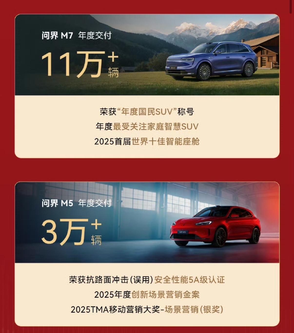 问界交出了2025年的答卷,新车交付累计422916辆,其中问界M5交付3万+、问界M7交付11万+、问界M8交付15万+、问界M9交付11万+,另外问界全系车型累计交付97万+。 问界M8可以说是最大的黑马👏🏻👏🏻