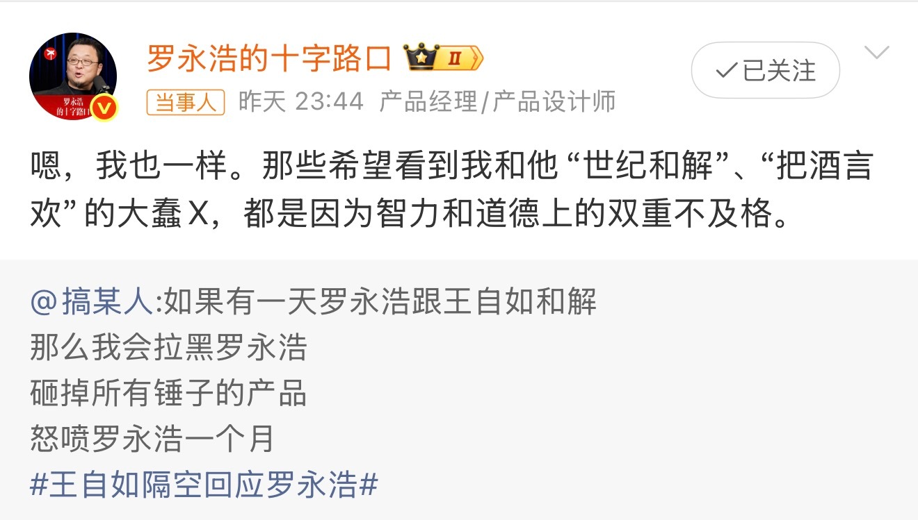 从王自如的角度来说,肯定希望再来一次对话,罗永浩的十字路口每期超2000万的播放量,再加上两位在之前的争议,有可能超过3000万,对王自如百利无一害。但对罗永浩来说,其实一点用没有,一不需要流量,二对节目没有任何帮助...所以,这场对话至少目前不可能