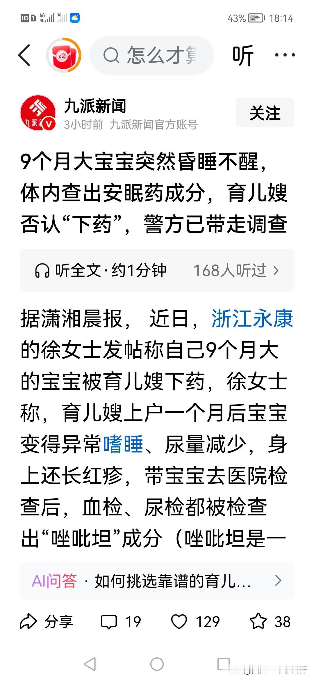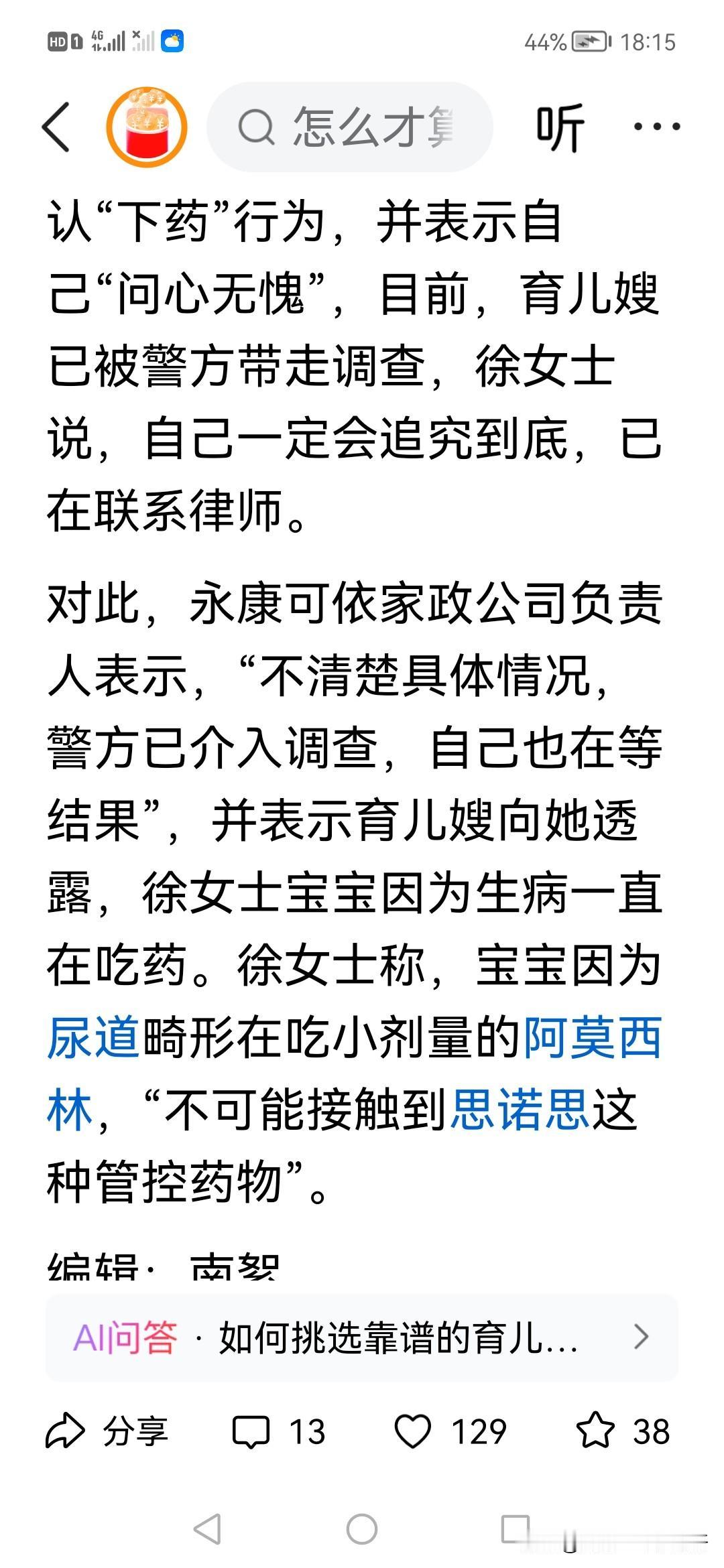 当育儿嫂凭良心赚钱,如果不能胜任就别干 那么大点孩子,体内有安眠药成分,哪来的,宝妈不至于糊涂的把自己吃的药给孩子下上吧。 育儿嫂不承认自己下了药,但是她难脱干系啊,带孩子,如果孩子是那种爱哭闹的,的确很累,但是育儿嫂高薪,是良心活,本来就辛苦,能干就干不能干别去碰人家孩子啊。 儿子小时候很厚道,没太耽误我休息,从出了月子他睡眠就很有规矩,醒了自己玩,和墙上画里宝宝聊天。我还不理解带孩子有那么累吗?后来聊起来同事说她当初儿子给她闹的 特别难。 所以到现在我对看孩子也没什么恐惧心里,反而觉得很幸福,看着他咿呀学语蹒跚学步,看着他很懂事又淘气的,老是觉得养育孩子是很幸福的生命历程。 这要是给那么小的孩子下安眠药心黑透了,孩子这一生会受多大影响!