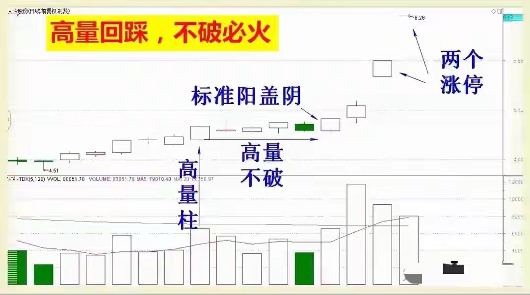 强势股秘诀:“高量回踩,不破必火”,看懂主力意图就这么简单你是不是经常遇到这种情况:看到一只股票强势上涨后开始回调,心里七上八下,不知道是该趁早离场,还是该坚定持有?尤其是当它回调到之前放巨量的位置时,更是让人纠结万分。你的忐忑我完全理解,因为如果看不懂量价语言背后的主力意图,我们很容易在启动前被甩下车。今天,我就把一套高效识别主力锁仓行为的核心战法——“高量回踩不破”分享给你,看完你就能明白,主力到底是在出货还是在洗盘,答案一目了然。还是老规矩,觉得干货有用,记得点赞关注支持一下,你们的认可就是我持续分享的动力。话不多说,我们直接进入正题。今天这个战法的核心口诀就八个字:“高量回踩,不破必火”。这到底是什么意思呢?“高量”,指的是股价在前期拉升过程中,所形成的阶段性最大成交量对应的那根K线区域,这个位置堆积了大量筹码,是多空交战最激烈的地带。“回踩”,就是股价经过上涨后,主动回调到这个高量柱对应的价格区域。“不破”,是精髓所在,意味着股价回调时,始终无法有效跌破这个高量区域的核心支撑(通常是高量柱对应的最低价或实体底部)。一旦出现这种形态,往往预示着“必火”,即后续极有可能展开新一轮强劲上涨。逻辑其实很清晰:前期放出巨量,说明有大资金在此处大量换手。如果主力意在出货,那么股价回调时必然轻松跌破这个成本密集区。但如果股价回踩到此就跌不动了,仿佛有一双无形的手在托着,恰恰说明之前进来的大资金根本没走,他们在这个位置死死锁住了筹码,回调只是为了清洗浮筹、抬高市场平均成本。这种“该跌不跌”的强势表现,就是主力高度控盘、志在高远的明确信号。理解了核心逻辑,我们再来细化这个战法的六大操作要点,每一条都至关重要:首先,选股要有前提。 目标个股在前期必须有过明显的强势特征,比如出现过涨停板,或者短期内有超过15%以上的流畅上涨。这证明该股有主力资金关照,市场活跃度高,具备再次起飞的基础。一个死气沉沉、毫无亮点的股票,很难走出标准的“高量回踩”形态。第二,趋势必须向上。 整个股价的运行框架要处于上升趋势或强势横盘整理中。中长期均线(如20日、60日均线)最好保持多头排列或走平向上。我们的操作是在上升途中寻找“加油点”,而不是在下跌趋势中猜底。第三,明确“高量”与“回踩”的标准。 这里的“高量”,需要是近一个多月以来最醒目的一根成交量柱,它标志着关键筹码区的形成。“回踩” 时,股价应主动缩量调整至这个高量柱对应的价格区间附近,回调过程成交量要明显萎缩,显示抛压减轻。第四,紧盯“不破”的确认信号。 这是决策的核心。股价回踩至高量支撑区时,可以盘中刺破,但收盘价必须收复,或者连续多日在该区域上方获得支撑。我们可以将高量柱的最低价设为核心防守线。同时,回调末端的单日换手率不宜过大,中小盘股最好控制在5%以下,表明没有恐慌盘出逃。第五,关注企稳与再次转强的K线。 当股价在支撑区附近收出止跌小阳线或十字星,且成交量再度温和放大时,这就是初步的企稳信号。这个阶段,股价不应长时间滞留在支撑区下方。第六,等待关键性的突破买点。 最理想的介入时机,是当股价结束回踩,再次放量上涨,并突破回调起始点(即前高附近) 的时候。此时,成交量最好能放大至高量柱水平的八成以上,这表明主力资金重新发力,新一轮升势有望开启。当然,任何技术形态都不是百分之百的保证。因此,我们在应用时必须做好风险控制。最清晰的止损位就设在高量柱的最低价。一旦股价放量有效跌破这个位置,说明支撑逻辑失效,我们应果断离场观望。此外,我们在判断时也可以结合其他工具进行多重验证。例如,观察股价回踩时是否触及布林线中轨或上升通道下轨并获得支撑;或者参考MACD指标,看其是否在零轴上方完成双线靠拢后再次张口。通过多维度观察,能进一步提升我们决策的成功率。