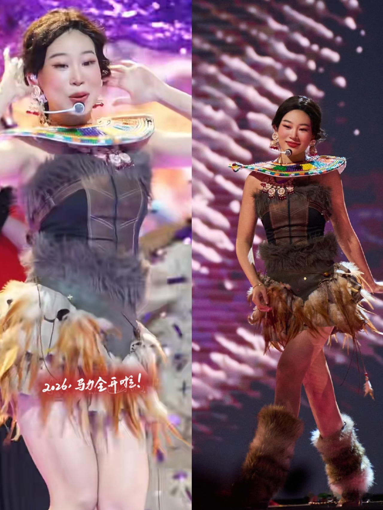 沈佳润真是个谜, 越来越看不懂她了 你说她好看吧,她眼睛有点小,圆肉嘟嘟的,在传统审美里,鹅蛋脸,大眼睛双眼皮才是大美女 再看这个舞台造型,上半身无袖,紧身几何纹路,感觉挺酷飒,下半身好像披了层枯叶,有点原始人类"野趣"的味道。 我没搞懂的是,中间那个大圆盘,红橙黄绿青蓝紫,像彩虹,下面又有漂亮的颈链点缀,不知道是哪个民族的服饰特色呢? 但看的出来她是真的好开心,非常享受舞台,有没有懂这套特色服饰的朋友,给科普下呗。