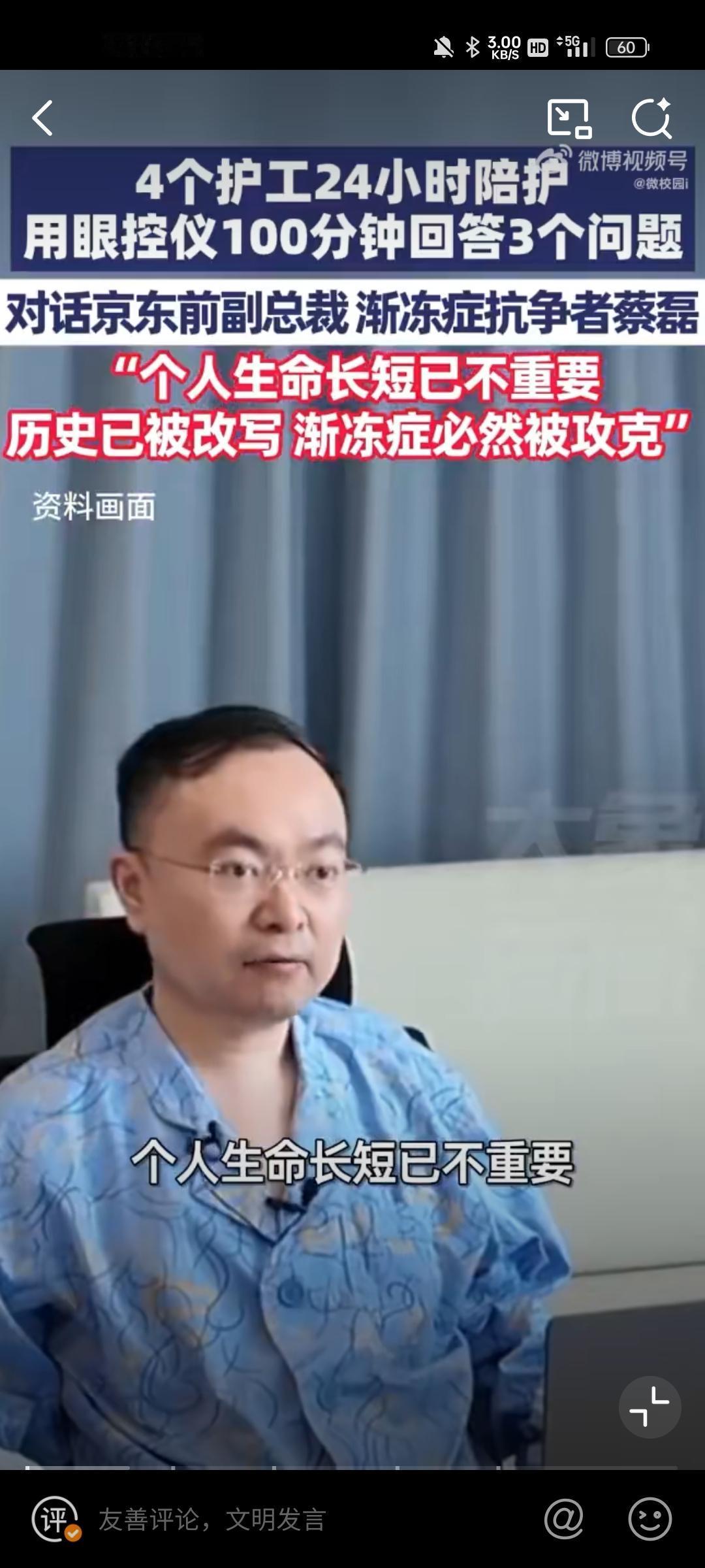 “个人生命长短已不重要,历史已被改写,渐冻症必然被攻克”,这句话是蔡磊借助眼控仪,花了整整100分钟才完成的三个问题的核心回应。此刻的他,早已不是当年意气风发的企业高管,而是被渐冻症困住的抗争者,需要4名护工24小时寸步不离地陪护,每一个简单的动作背后,都是常人难以想象的艰难。 渐冻症医学上叫肌萎缩侧索硬化,是一种慢性进行性神经系统变性疾病,患者会眼睁睁看着自己的肌肉逐渐萎缩无力,最终连呼吸都无法自主,却始终保持意识清醒,平均生存期只有3到5年。与病魔抗争多年的蔡磊,身体功能评分早已从满分48分降到个位数,进入了疾病终末期。如今的他五体瘫软,无法说话,压痛、呛咳、吞咽困难和窒息感每天都在折磨着他,连从椅子上坐直都需要四名护工合力搀扶,稍有不慎就可能发生危险。每隔两小时,护工就得帮他躺下拍打身体缓解疼痛,喝水也要用加了增稠剂的液体,避免呛咳。 即便如此,蔡磊的生活依然被工作填满。他的房间里摆满了钟表,作息规律到分秒,常常工作到凌晨一两点,只要身体允许就绝不停下。这次接受采访,光是回答三个问题就用了100分钟——他需要通过眼控仪追踪光标,逐字逐句地在屏幕上拼写,打出答案后还要让机器语音播放一遍,再返回修改完善,最后整理成完整回复发送,这份对事情的较真和坚持,让人动容。他说自己很幸运,能在患病后投入到攻克人类难题的事业中,比起个人多活几年,推动渐冻症治疗进展更有意义。 在大多数人眼里,绝症患者本该静养等待,但蔡磊却走出了一条截然不同的路。他认为绝境中的患者有着常人难以想象的力量,这种不惜一切代价的专注和坚定,是普通工作者难以具备的。这几年里,他投入超过一亿元,搭建起“渐愈互助之家”这个全球最大的渐冻症患者科研数据平台,注册患者已经突破1.8万人。通过联动全球60多个顶尖科研团队、50多家生物科技公司和十余家医院,推动了近百个科研项目,还助力15条药物管线及治疗技术实现临床转化突破,让渐冻症的研发进度至少加快了十年。 更让人振奋的是,他团队推进的部分基因类型渐冻症治疗药物,已经取得了领先世界的疗效,有患者仅需几次治疗就明显改善健康状态,改写了生命轨迹。蔡磊借助人工智能搭建的“AI科研大脑”,更让科研效率提升了百倍以上,首次发现了临床前动物模型上治愈渐冻症的可能路径。他还设立了“破冰”奖学金,鼓励年轻研究者投身渐冻症研究,试图构建以患者为中心的罕见病创新框架。 在他看来,攻克渐冻症的核心不是缺钱,而是缺乏更多愿意全力以赴的推动者。虽然科研进展有时会陷入缓慢甚至停滞,但他从未动摇。100分钟的缓慢回应,背后是他用生命与时间赛跑的决心;那句坚定的宣言,不仅是对自己的鼓励,更是给上万名渐冻症病友的希望。他用日渐枯萎的身体,点燃了攻克绝症的火种,让人们看到,即便被命运禁锢,精神也能拥有冲破一切的力量。渐冻绝症 蔡磊寄语年轻人