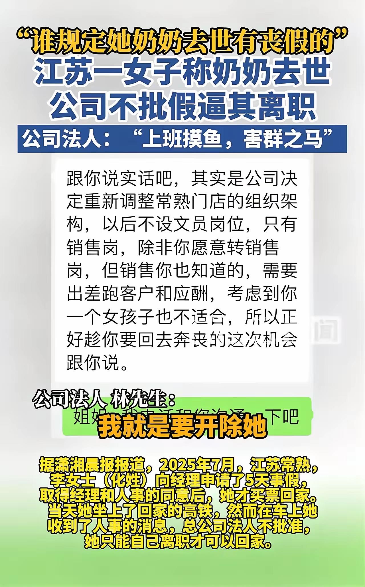 “谁规定她奶奶去世有丧假的!“江苏,一女子奶奶去世,公司老板却不批假逼她离职!老板:“谁家爷爷奶奶不去世,这有什么好请假的……” 2025年7月,江苏常熟的李女士攥着手机,指尖冰凉。屏幕那头,是奶奶离世的噩耗,那个从小把她搂在怀里讲故事、省着口粮给她塞零食的老人,再也见不到了。 她强压着哽咽向公司申请5天事假,经理和人事都点了头,她才匆匆买了回家的高铁票。可车轮刚滚动,人事的消息就炸了屏:“老板不批假,要走就只能离职。” 李女士的眼泪唰地掉下来,追问之下才知真相——公司要撤掉文员岗,劝她转销售被拒后,老板竟想借着奔丧这件事,“零成本”把她赶走。 “谁规定奶奶去世能请丧假?”记者联系到公司法人林先生时,对方的话淬着冰,“谁家爷爷奶奶不过世?她就是上班摸鱼的害群之马,我就是要趁这时候赶她走。” 这话像刀子,扎得人疼。李女士所在的分公司既无监控也无打卡记录,所谓“摸鱼”不过是借口。更让人心寒的是,她入职一年多,公司连社保都没给缴。 她没忍气吞声,回家料理完奶奶后事,就寄去了《被迫解除劳动关系通知书》,随后申请了劳动仲裁,开庭日期定在2026年1月29日。她要的不是输赢,是讨回被践踏的尊严。 网友的议论炸开了锅。有人说:“我们这代人多是爷爷奶奶带大的,送最后一程是底线,这老板没心。” 也有人搬出法条:“就算祖父母不算法定直系亲属,事假也该酌情批。上海就有类似案例,公司开除奔丧员工,最终赔了七万多 。” 还有人揣着恶意揣测:“会不会是员工平时真不称职?”可再怎么样,落井下石也绝非企业该有的模样。 法律早有定论,违法解除劳动合同要付二倍经济补偿金。用人单位行使管理权,总得守着善意的底线,不能把规章制度当成冷血的挡箭牌 。 鲁迅说,人类的悲欢并不相通,我只觉得他们吵闹。可这不通的悲欢里,总该留着一丝对生命的敬畏,对亲情的体恤。 一个企业,连员工的丧亲之痛都能拿来做文章,连最基本的人伦都不顾,就算赚得盆满钵满,也不过是精神上的乞丐。 员工不是机器,是有血有肉的人。谁没有生老病死,谁没有至爱亲朋?今日你对他人的苦难冷眼旁观,明日你的企业遭遇困境,又怎能指望员工不离不弃? 李女士的仲裁结果还未可知,但法律从不会偏袒冷血者。那些打着“管理”旗号践踏人情的企业,终会为自己的凉薄付出代价。 只愿这世间少些这样的荒诞,多些共情与温暖。毕竟,规矩之外,更有人心。