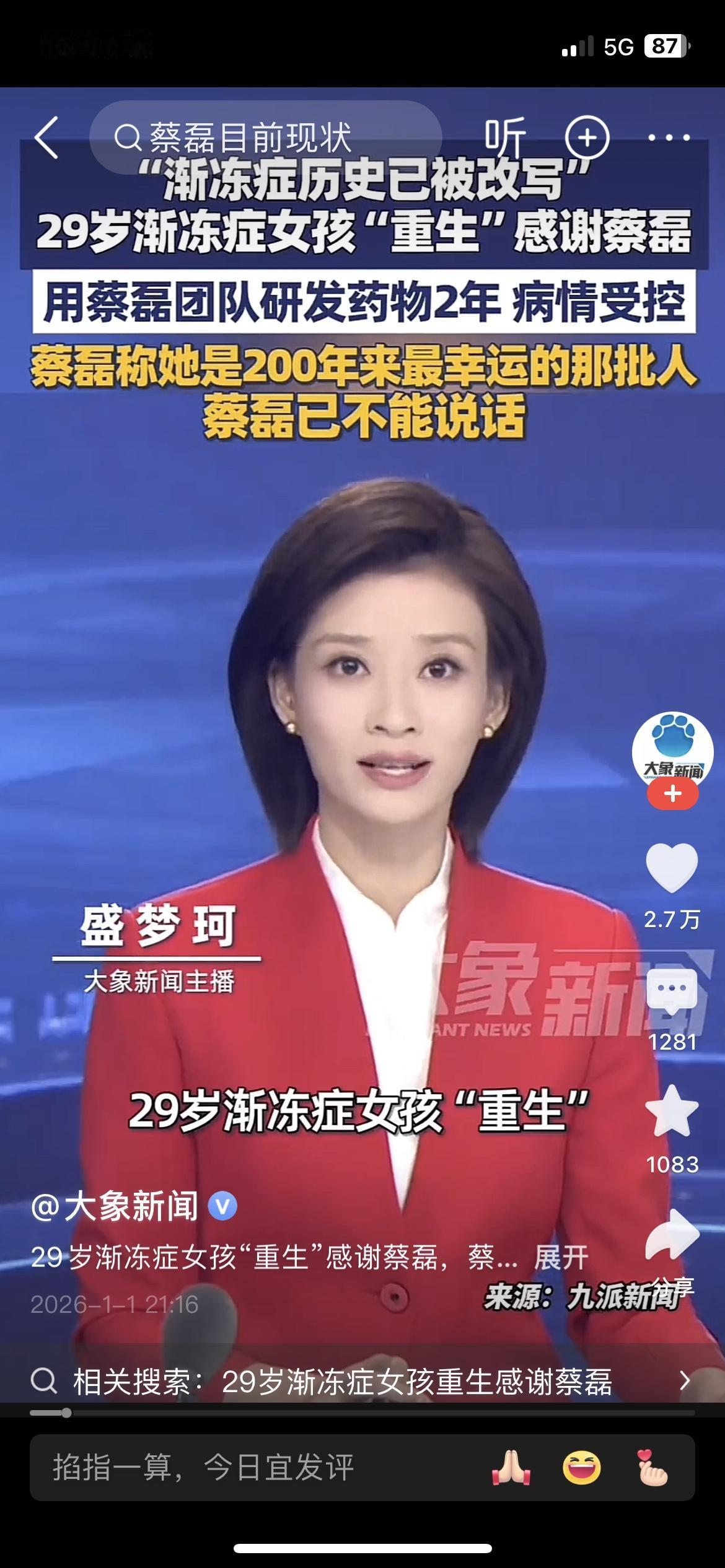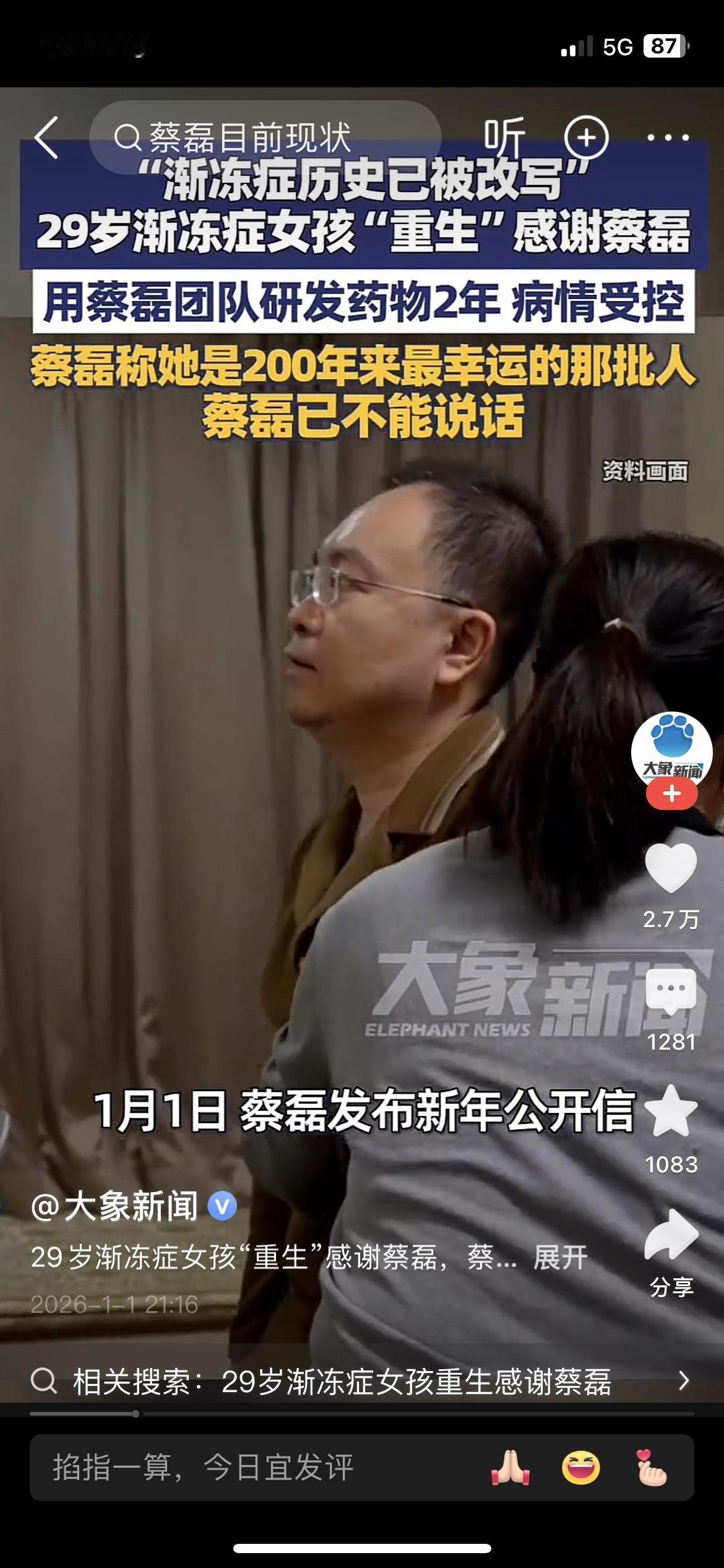 29岁渐冻症女孩遇蔡磊获新生,渐冻症治疗迎突破 ▫️元旦刚过,一则渐冻症治疗的消息戳中无数人💔 ▫️29岁的小刘确诊渐冻症后,曾陷入绝望 ▫️用上蔡磊团队研发的药物,2年病情被成功控制 ▫️蔡磊直言,她是200年来最幸运的那批人 ▫️而如今的蔡磊,已经无法开口说话 ▫️想起小区里那位渐冻症大叔,从能走路到只能靠呼吸机,不过两年时间,家人熬得满眼红血丝。小刘的经历,让这类家庭终于看到了光✨ ▫️蔡磊哪怕自身病重,仍咬牙推动药物研发,这份坚持太戳心了 你身边有接触过渐冻症患者吗?你觉得这类罕见病药物研发,还需要哪些社会支持? 渐冻症治疗新突破渐冻绝症 渐冻群体