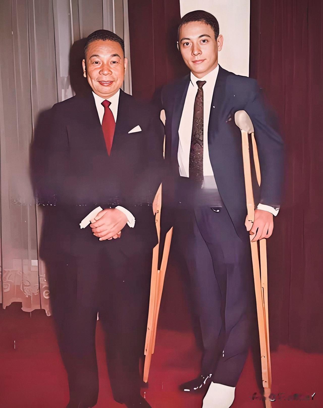 这是蒋经国和他的儿子蒋孝文一同参加活动时的一张合影老照片,拍摄于1970年的台湾。这并非演戏,也并非影视剧里的演员,而是他们父子二人当时的真实貌相。彼时蒋经国60岁,西装革履,面带微笑。蒋孝文35岁,虽拄着拐杖,但看起来英俊帅气。