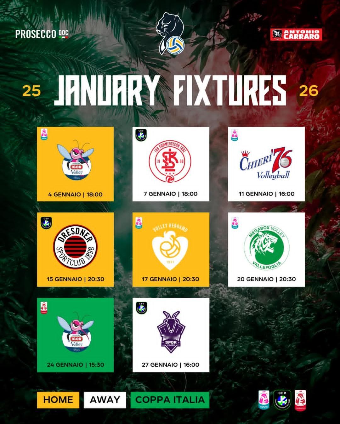 科内利亚诺的一月份赛程,硬仗不少,要打两次诺瓦拉!朱婷